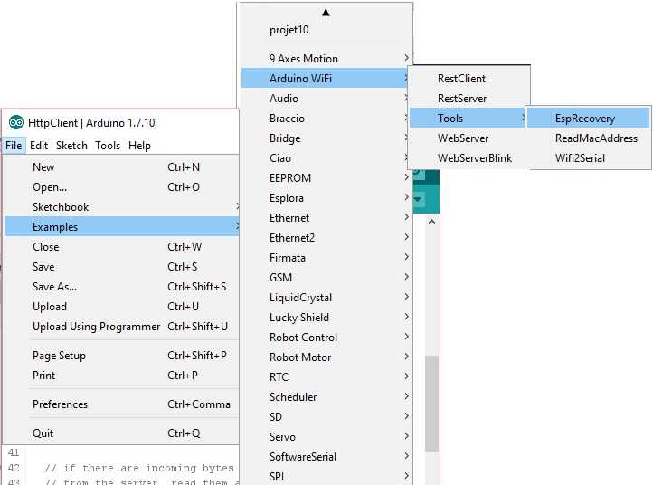 Upload the ESPRecovery sketch from File>Examples>Arduino UNO WiFI>Tools menu of Arduino Software (IDE):