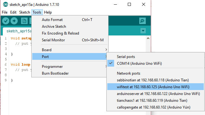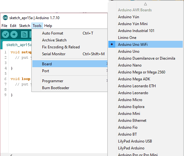 Select the board: Arduino UNO WiFi from Tools>Board menu.