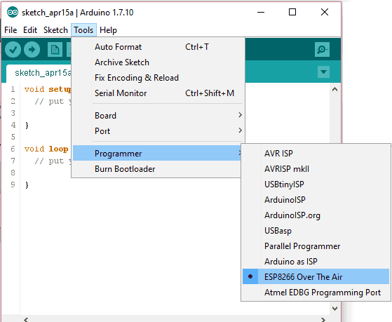 - Select the Programmer from Tools>Programmer>ESP8266 Over The Air menu.