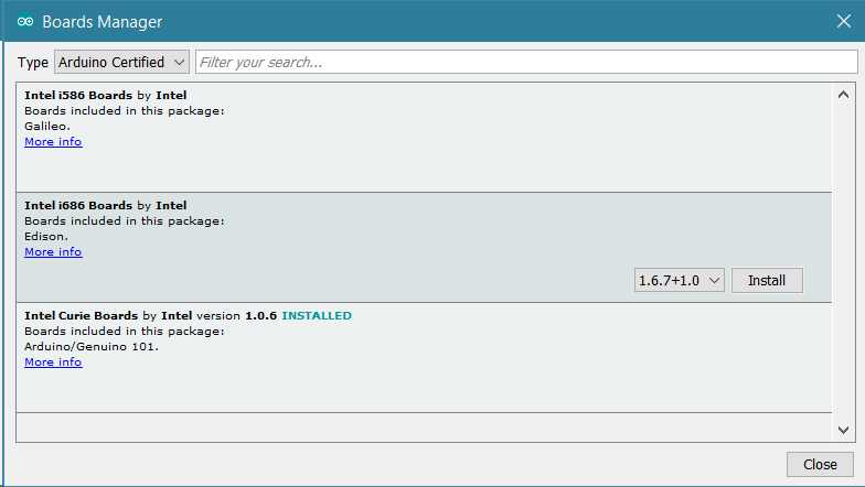 This simple procedure is done selecting Tools menu, then Boards and last Boards Manager. Select Arduino Certified as type and then click on the Intel i686 boards by Intel. Select the latest core and then Install.