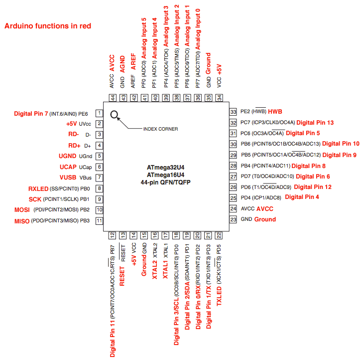 A diagram showing the correspondence between the pins on an Arduino board and those of the ATmega32U4 microcontroller.