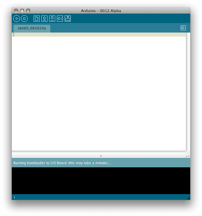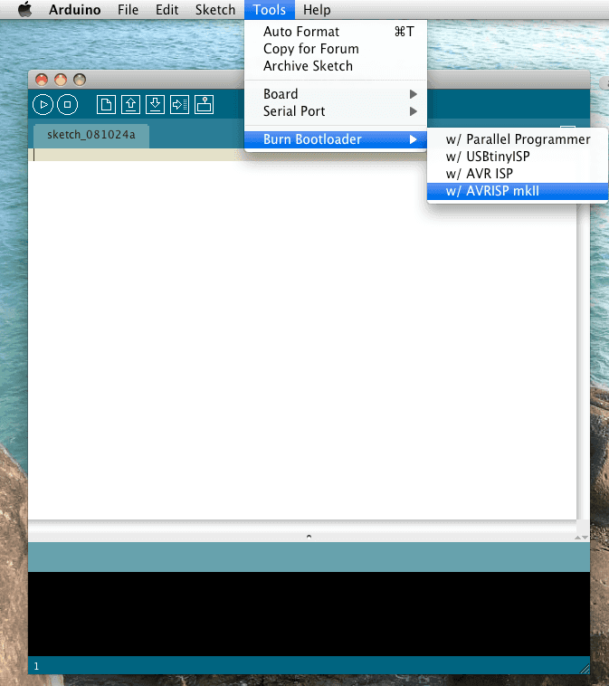 Once you chose your programmer, the AVR programmer will begin bootloading your Atmega chip and a message will appear in the status bar which reads "Burning bootloader to I/O Board (this may take a minute)..." Lights will flicker on your programmer.