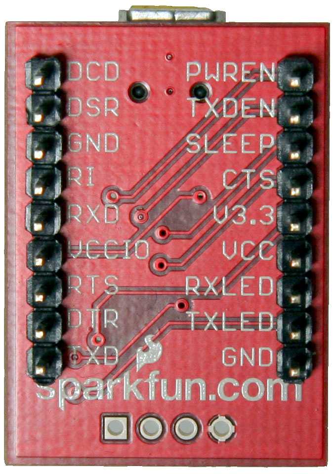 Curious what all the pin outs are for the SparkFun FT232 breakout board, just simply flip it over! In this situation we'll be using VCC (to supply 5V from the USB port to your board), GND, TXD, and RXD.