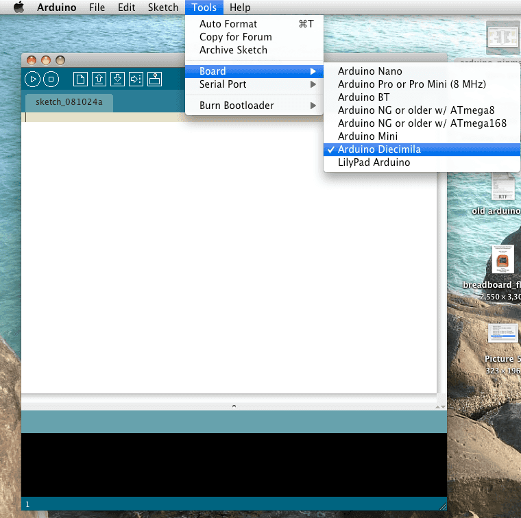 Fire up Arduino and then go to 'Tools' and 'Board'. Choosing the type of board you'd like to use will effect which bootloader you will be put on your chip. Most commonly you will be using the Diecimilia or the most recent version of Arduino for an Atmega PDIP, however if you'd like to bootload an Arduino Lilypad, Arduino Mini, Arduino Nano, or any of the older Arduino versions, choose the appropriate board.