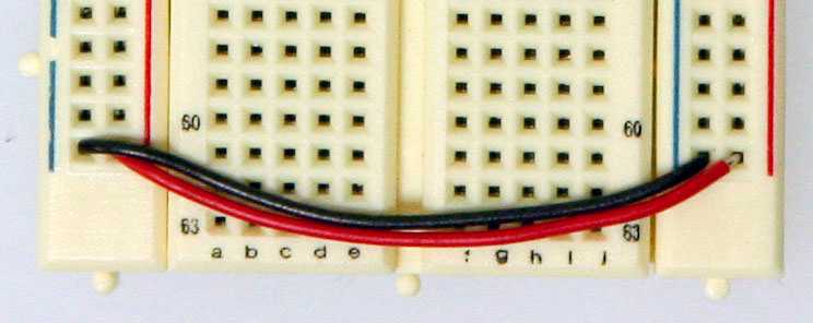 With the breadboard you prepared above, add two wires for power and ground for your AVR programmer.