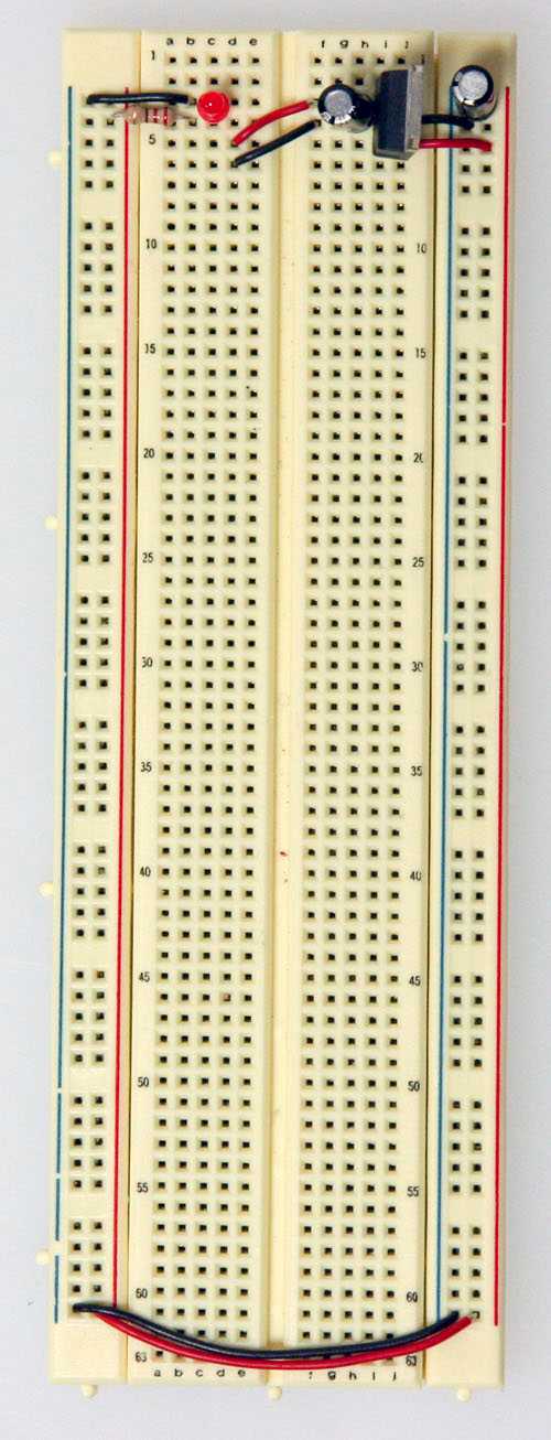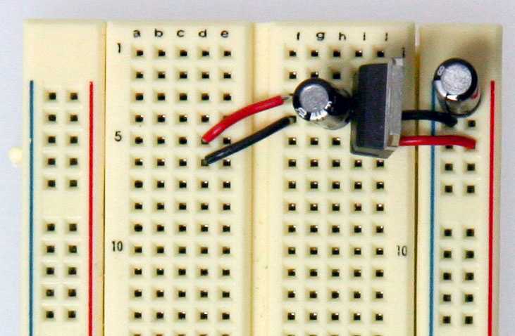 Also, add a 10uF capacitor between the IN of the regulator and the ground as well as a 10uF capacitor on the right rail between power and ground. The silver strip on the capacitor signifies the ground leg.