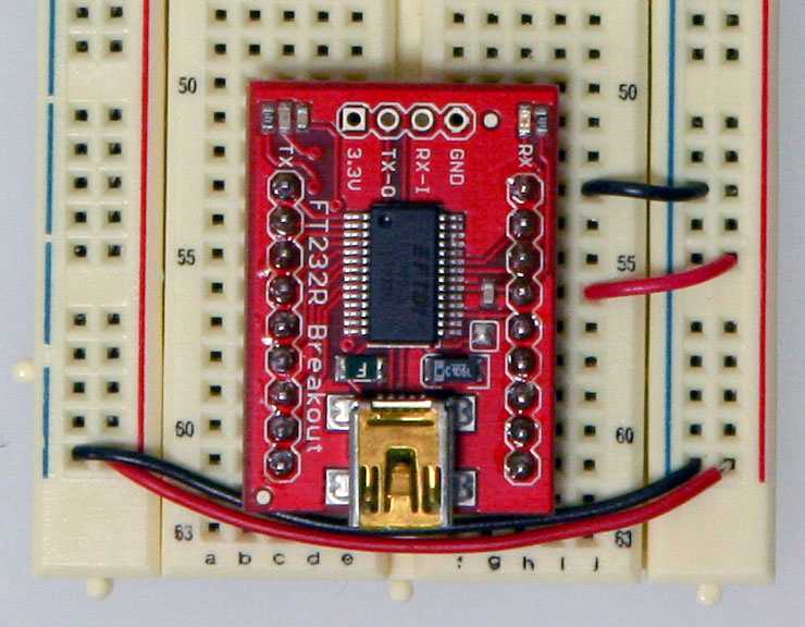 Now, it's time to get the USB to serial breakout board talking with your new Arduino setup. Connect the RX (pin 2) of your Atmega chip to the TX of the USB to serial board, and connect the TX (pin 3) of your Atmega chip to the RX of the USB to serial board.