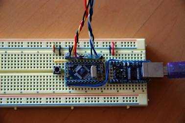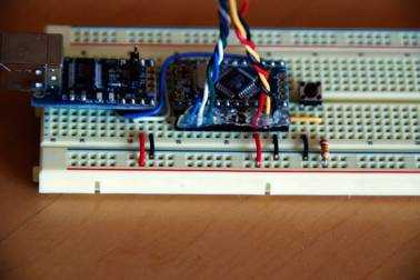 Mount your Arduino Mini on a breadboard, as shown (note that you will have to remove the LED on pin 13 during programming):