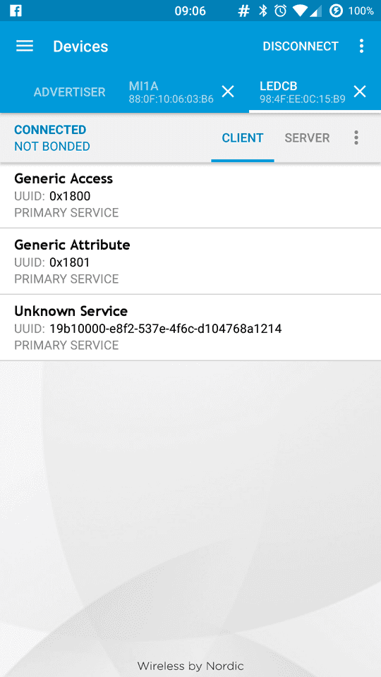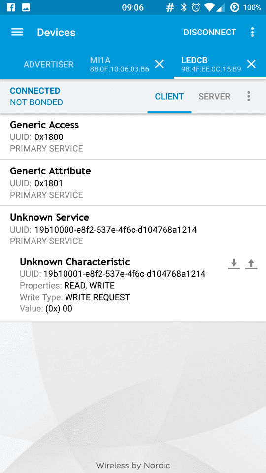 BLEService ledService("19B10000-E8F2-537E-4F6C-D104768A1214"); statement at the beginning of the sketch.Tap the Unknown Service to open up its characteristic, as shown below. It includes properties that can be written with a Write Request. you also find two icons on the right of the Unknown Characteristic. The arrow pointing down means read, the other means write.