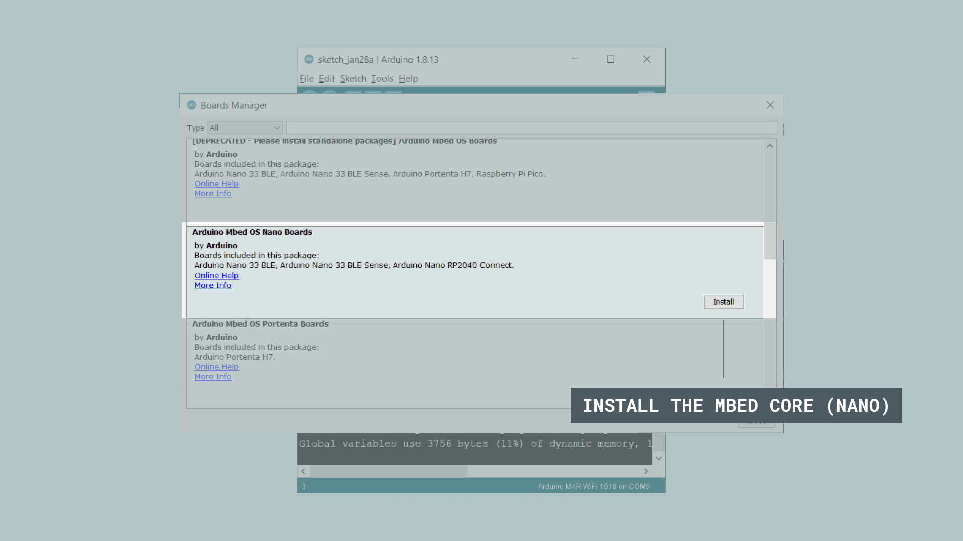 A step-by-step guide to install the core needed for the Nano 33 BLE, Nano 33 BLE Sense and Nano RP2040 Connect boards.