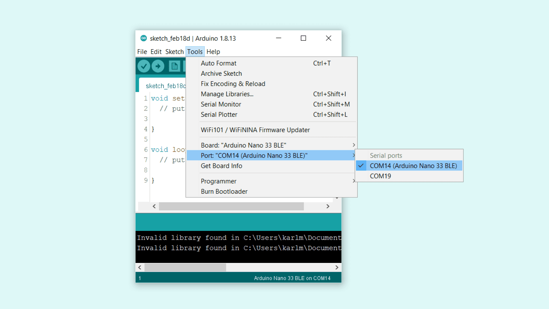 Now, let's make sure that our board is found by our computer, by selecting the port. Regardless what kind of program we are uploading to the board, we always need to choose the port for the board we are using. This is simply done by navigating to Tools > Port, where you select your board from the list.