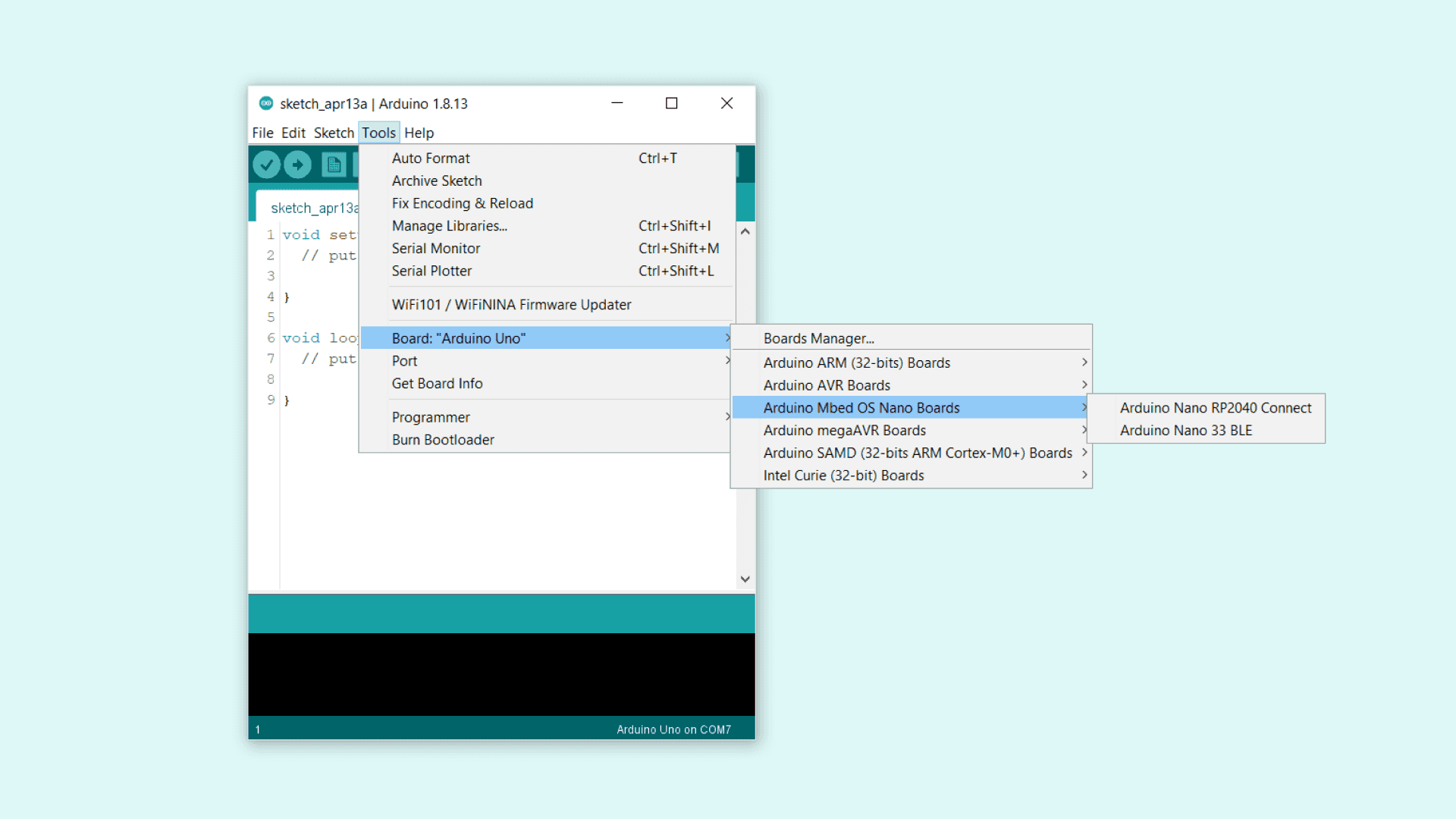 Exit the board manager, and go to Tools > Board > Arduino > Arduino Mbed OS Nano Boards. Here you can see all the Mbed boards listed, where you can select the board you are using. You have now successfully installed the core.