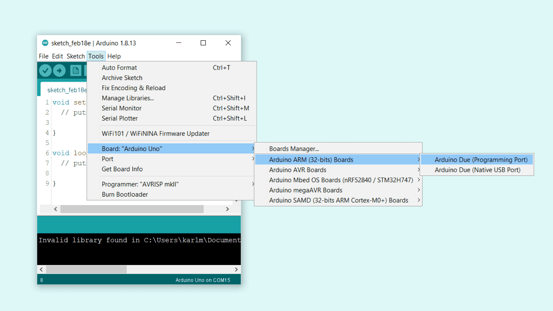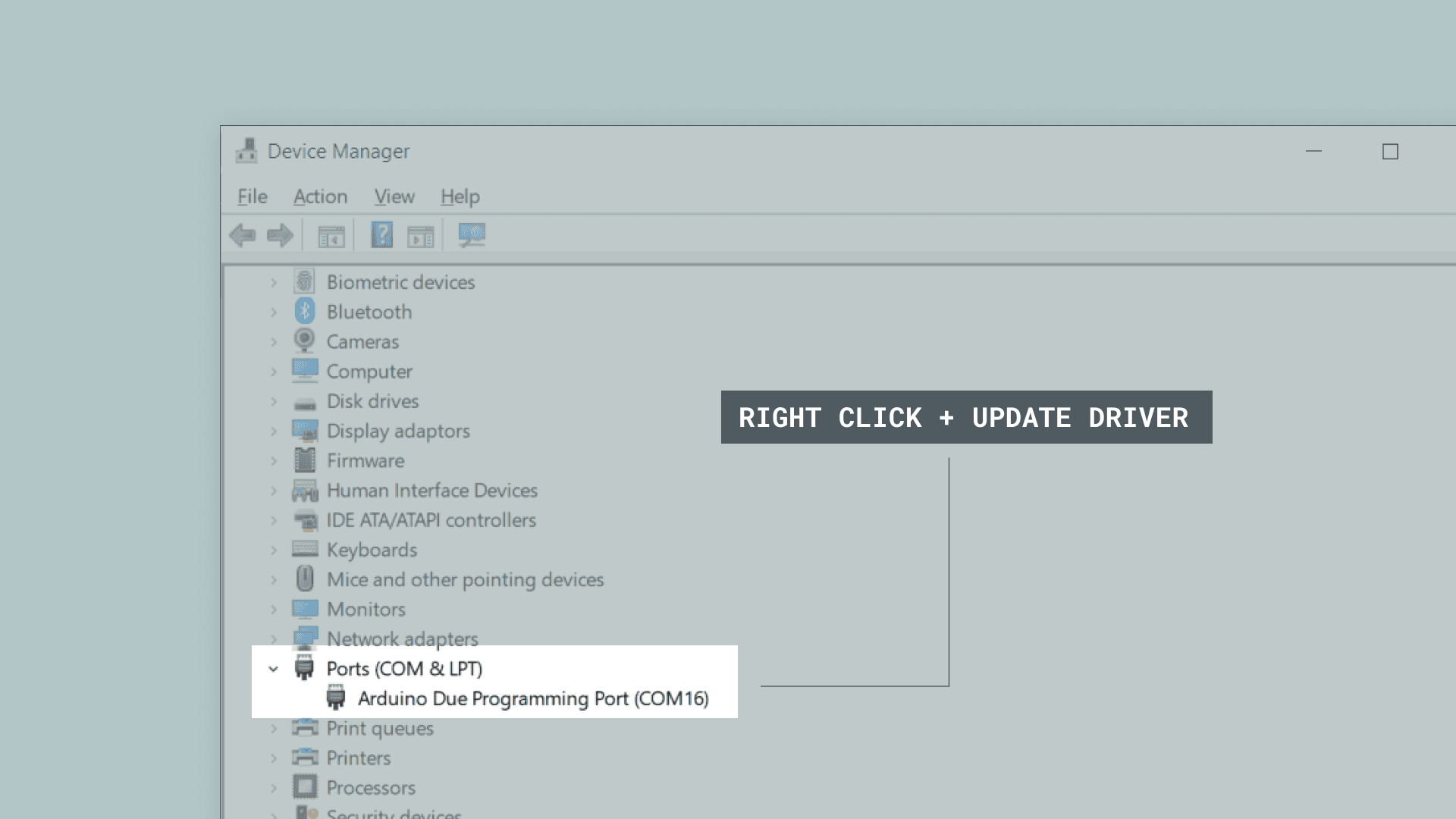If you cannot see your Arduino Due in the port list, you may need to manually update the driver. Don't worry, this is a quick process!