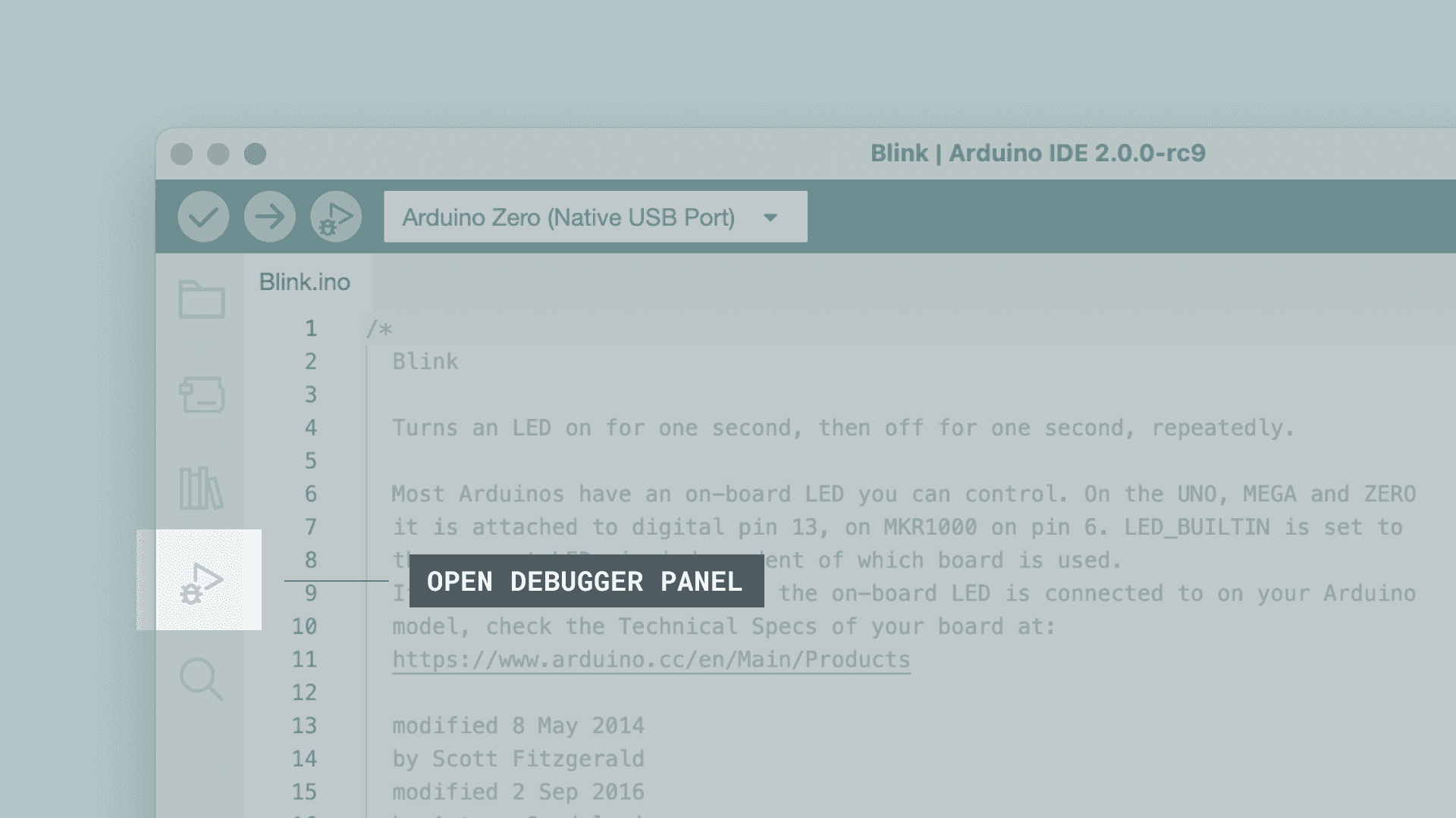 The Debugger is a brand new tool integrated in the Arduino IDE 2. You can easily access it from the sidebar on the left, grouped with the Board Manager, Library Manager, Search and Sketchbook Explorer.