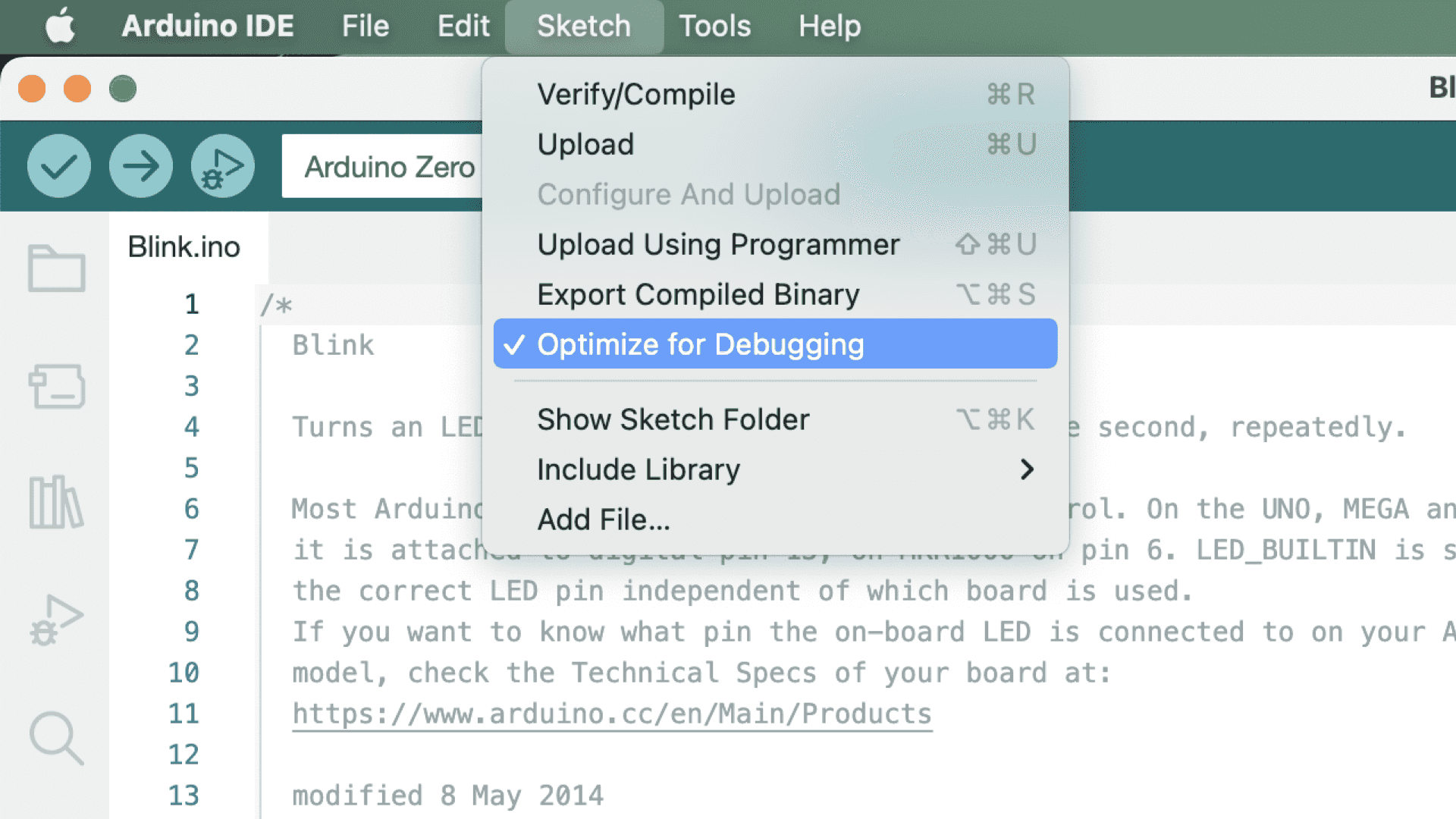 In order to use the Debugger, we need to upload a sketch to our board first, making sure that the built program will be optimized for debugging, so let's check that option right away.