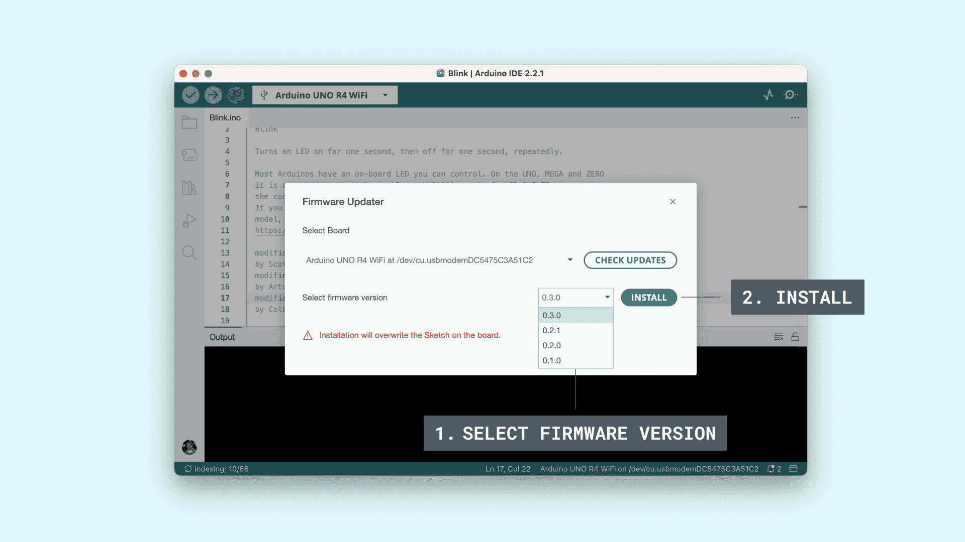 The Firmware Updater tool will overwrite any existing sketch on your board.