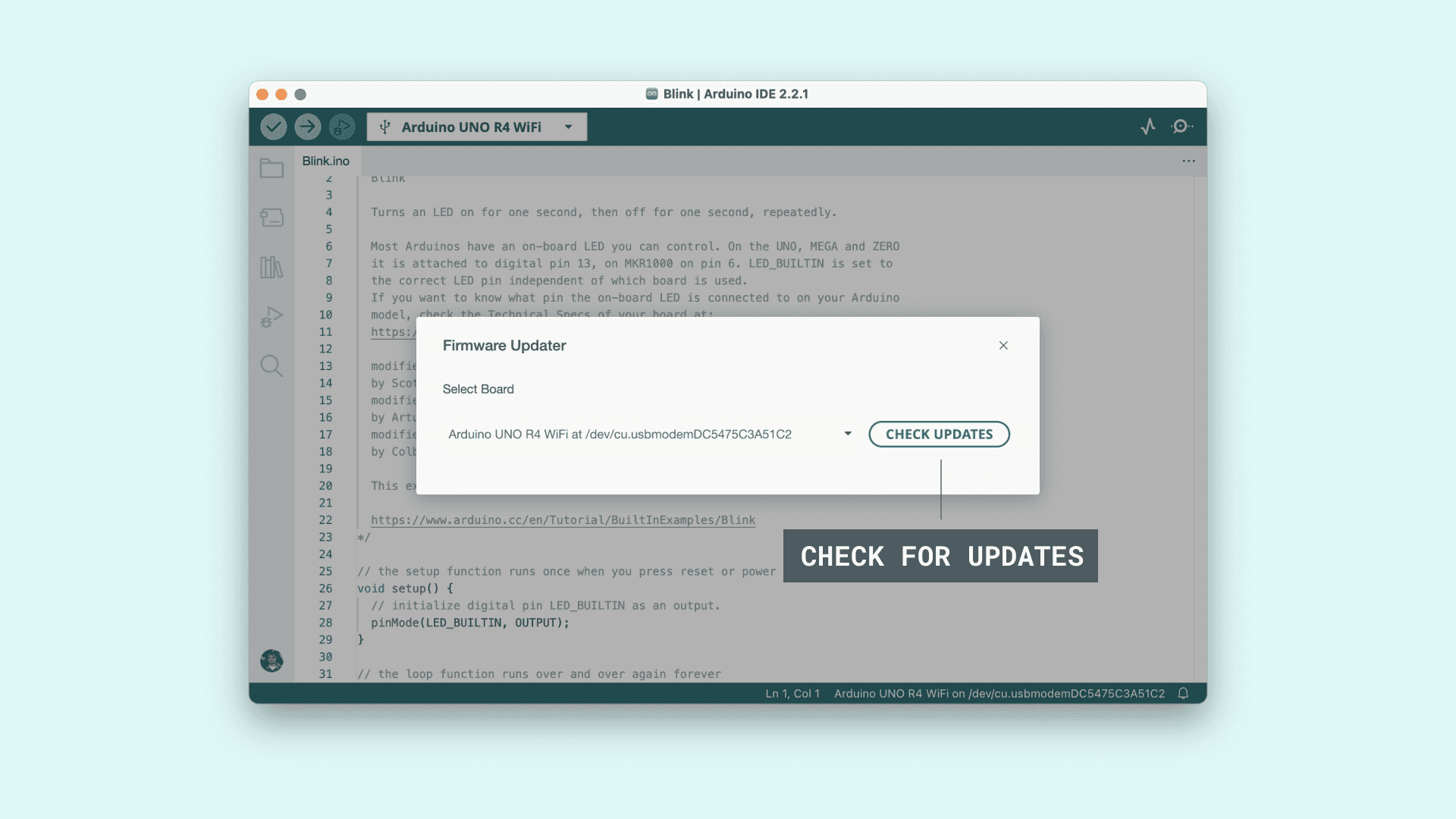 3. A new window will open. Select your board from the drop down menu, and press the button to check for updates.