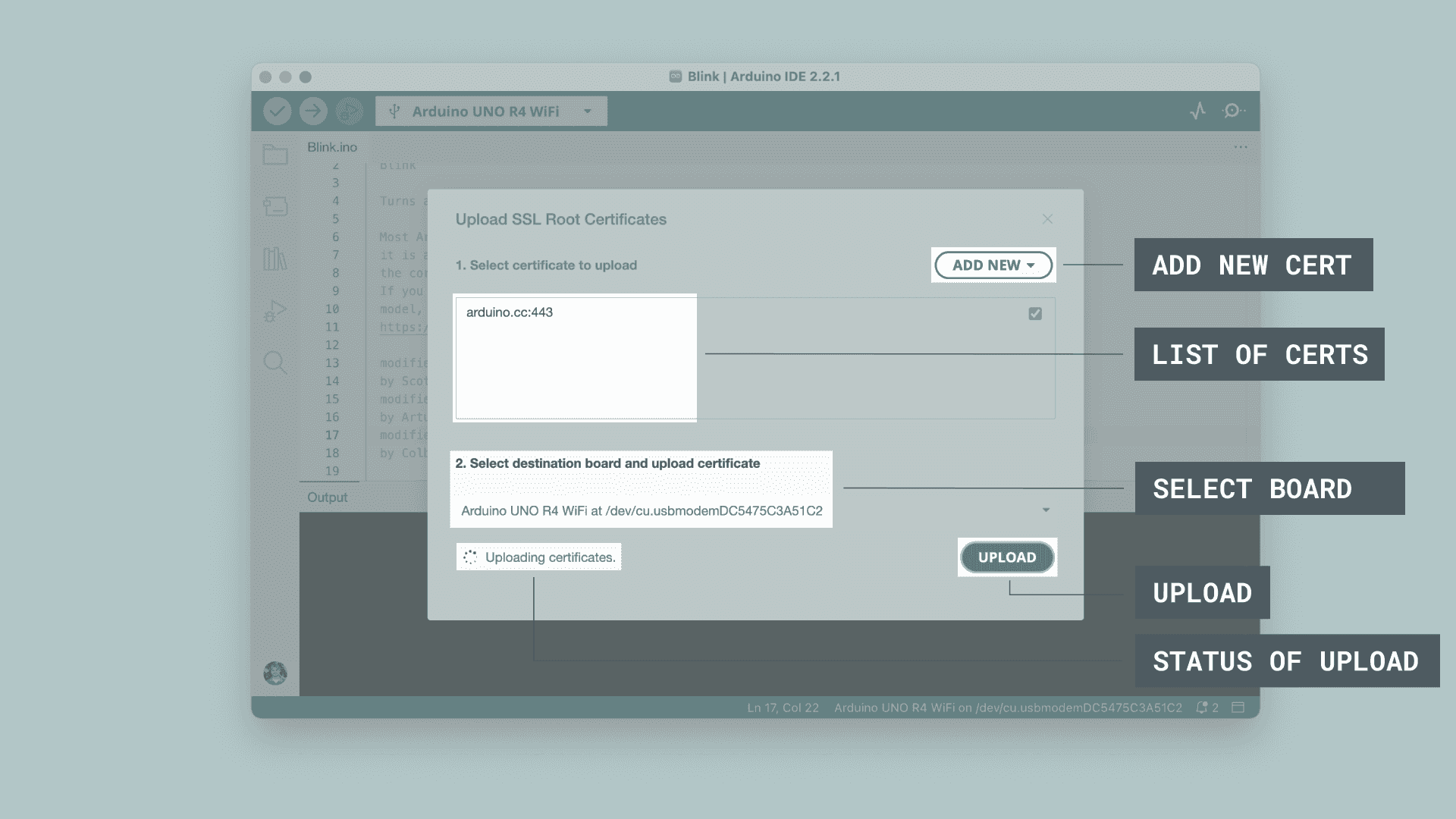 2. Open the Arduino IDE 2, and navigate to Tools > Upload SSL Root Certificates.