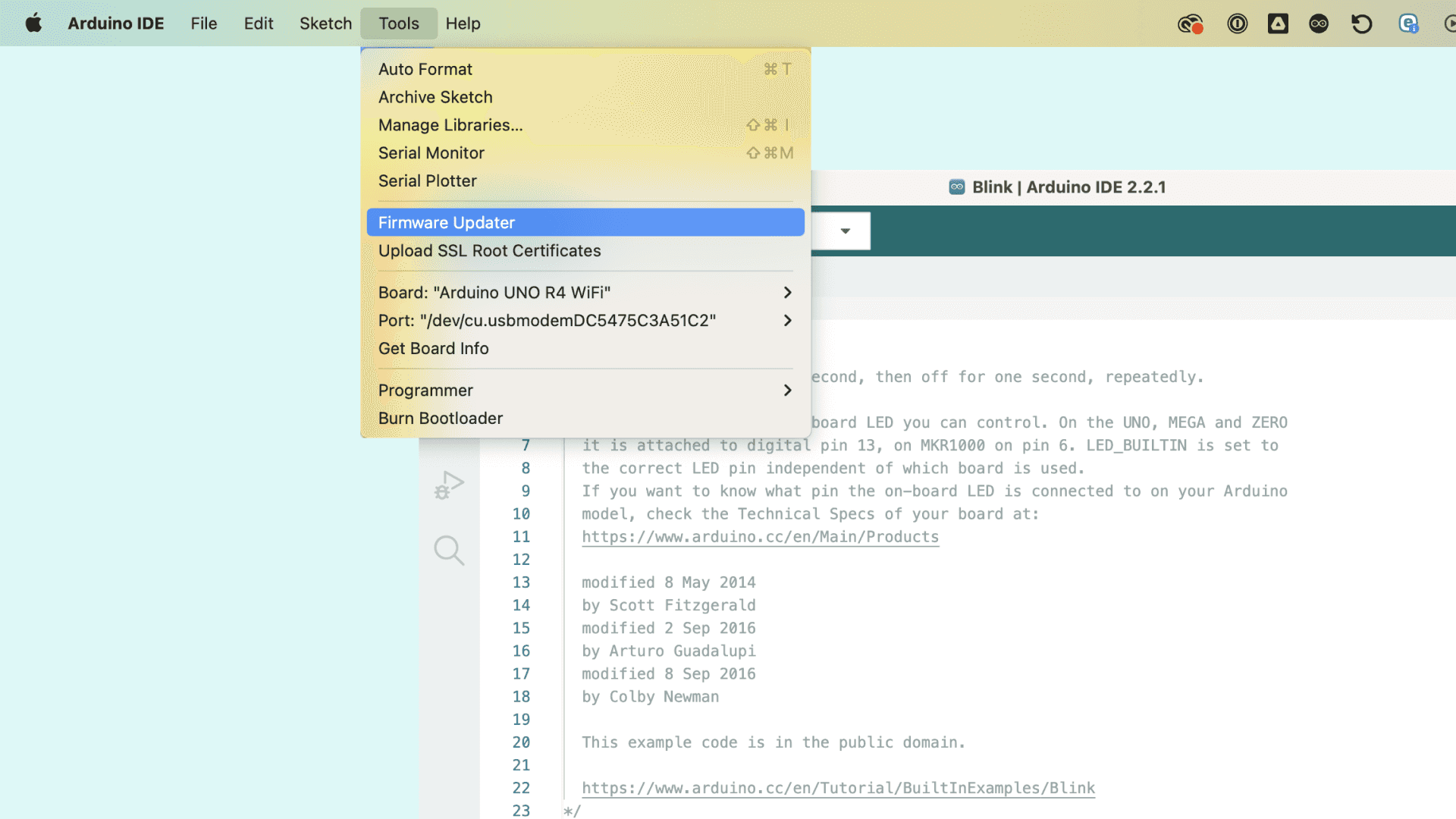 2. Open the Arduino IDE 2, and navigate to Tools > Firmware Updater.