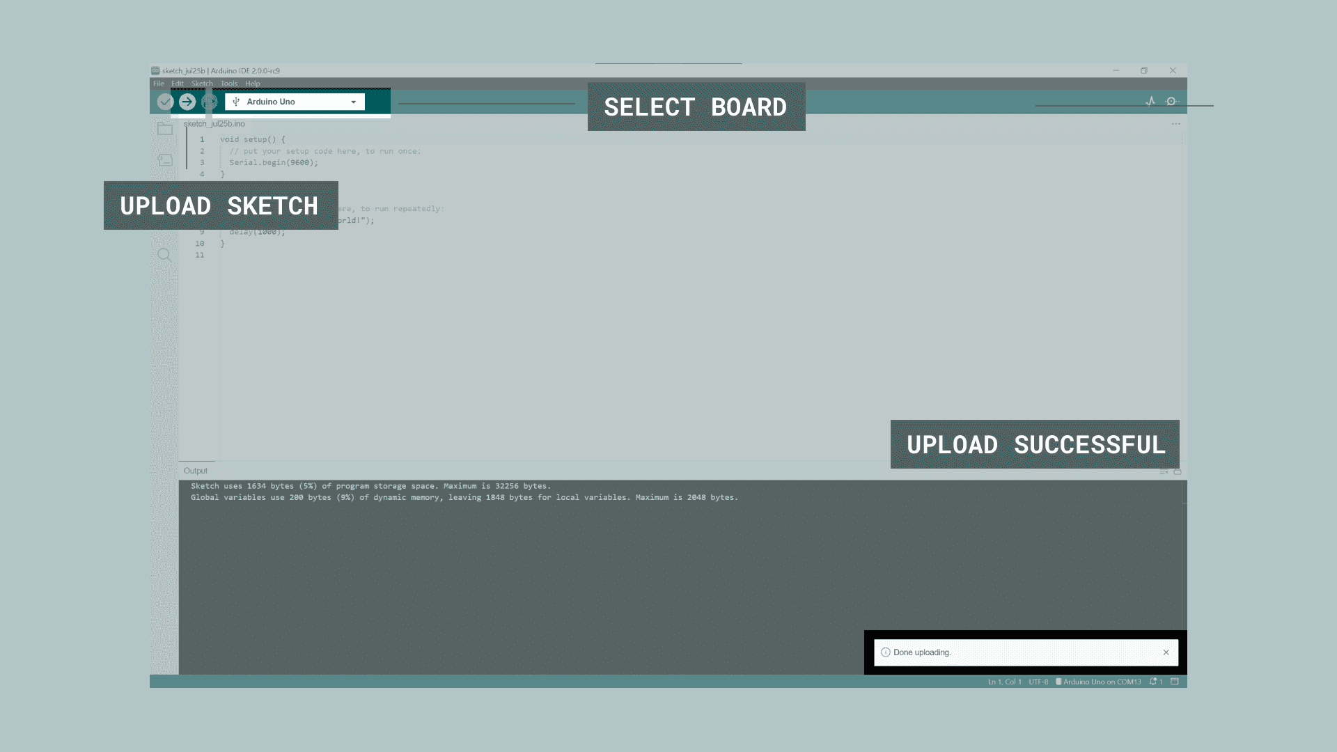 "Hello world!", every one second to the Serial Monitor. Let's select the board we want to use, and upload the sketch to the board.