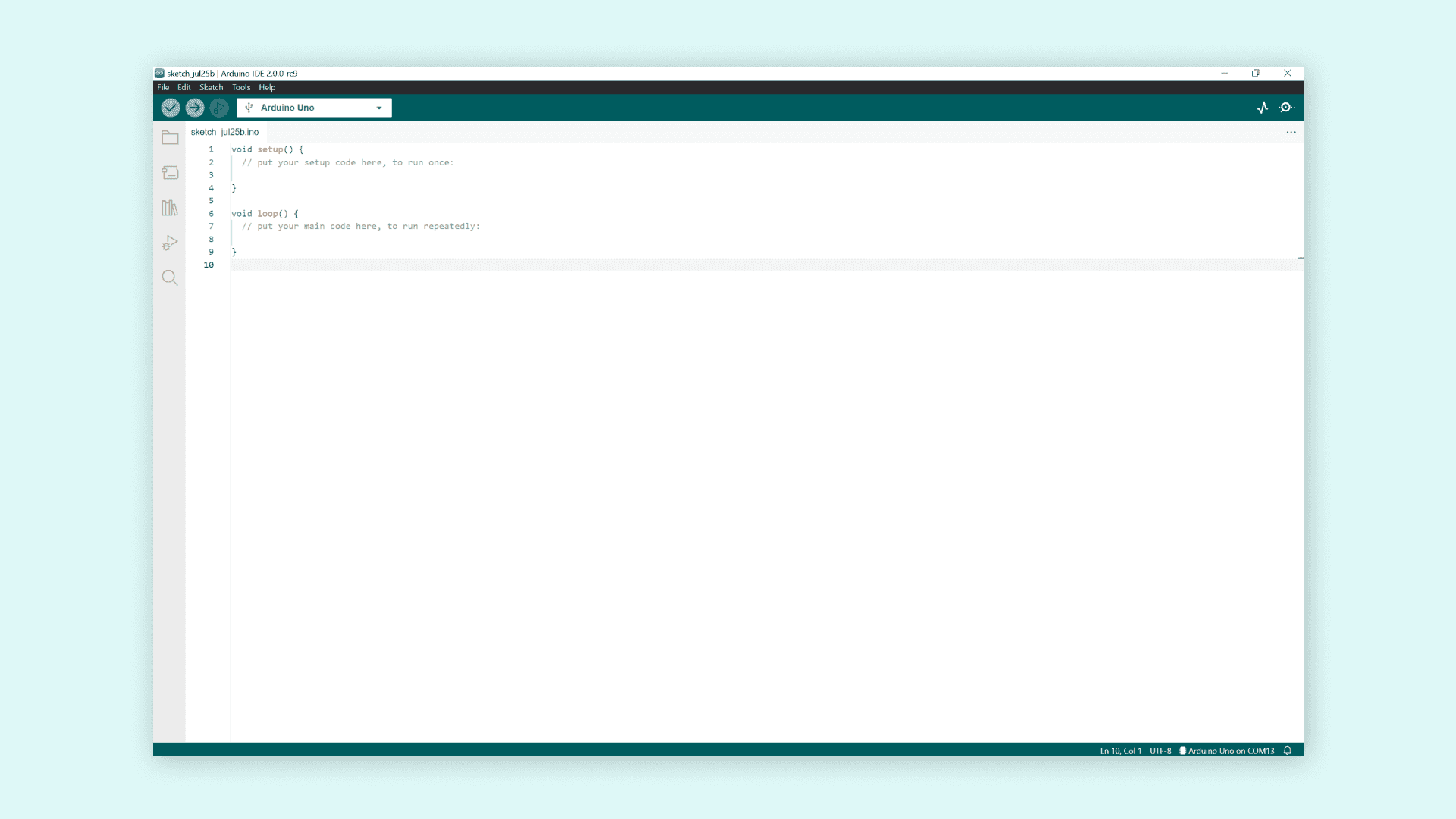 2. Now, we need to create a sketch that includes some configurations needed, so that our board can communicate with our computer. Mainly, we need to set a baud rate, which is done by writing