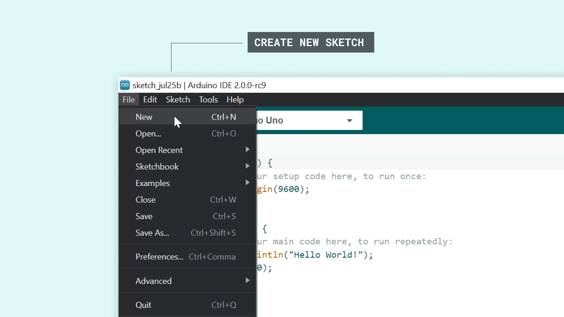 "Hello world!", with something else. In this example, we used "Hello Mars!", as you can see in the code snippet below:1void setup() {2Serial.begin(9600);3}4