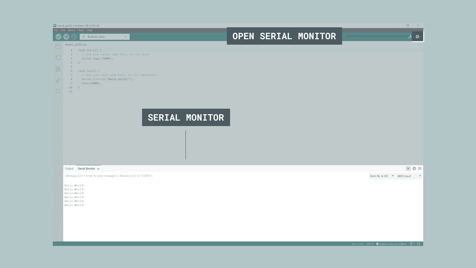 "Hello world!" is now printed every one second. Congratulations, you have now successfully sent a message from your Arduino, to your computer. Using Multiple Serial Monitors Simultaneously