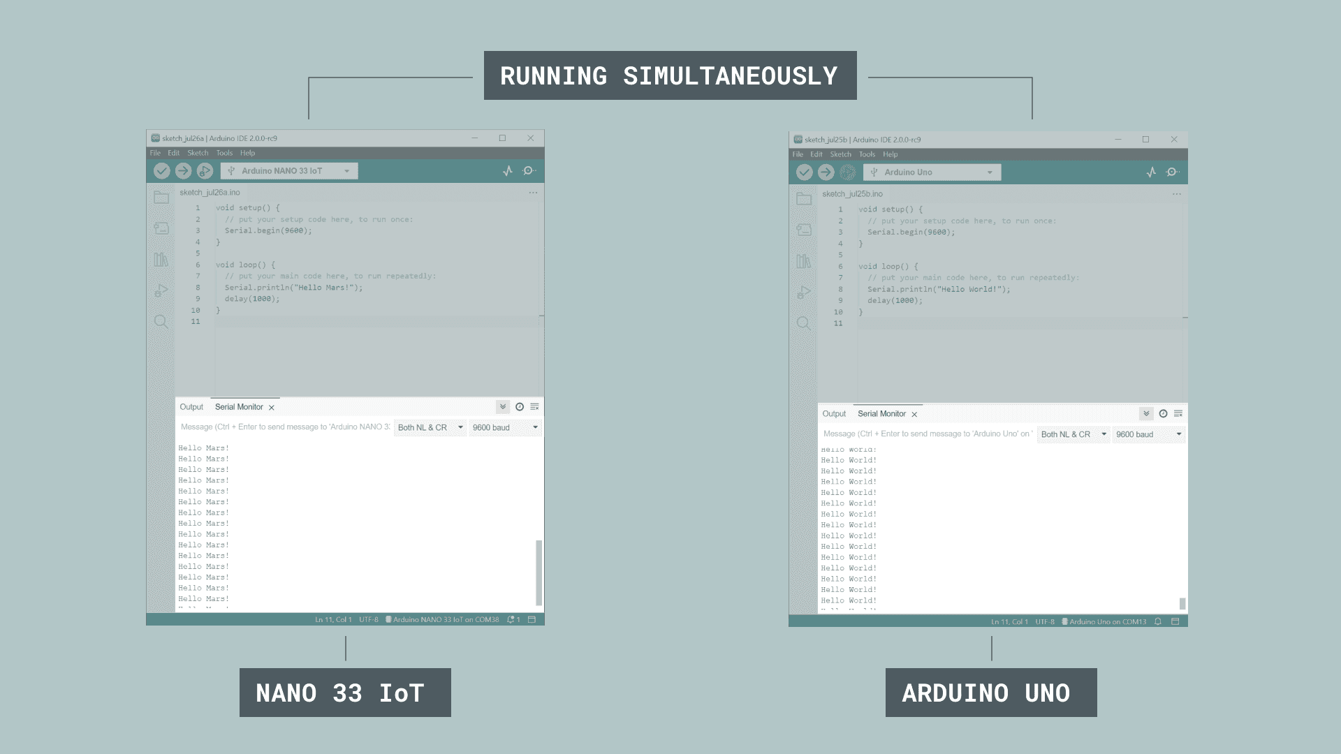 "Hello Mars!" being printed every one second. If we put the two sketch windows side by side, we can see how they are printing at the same time.