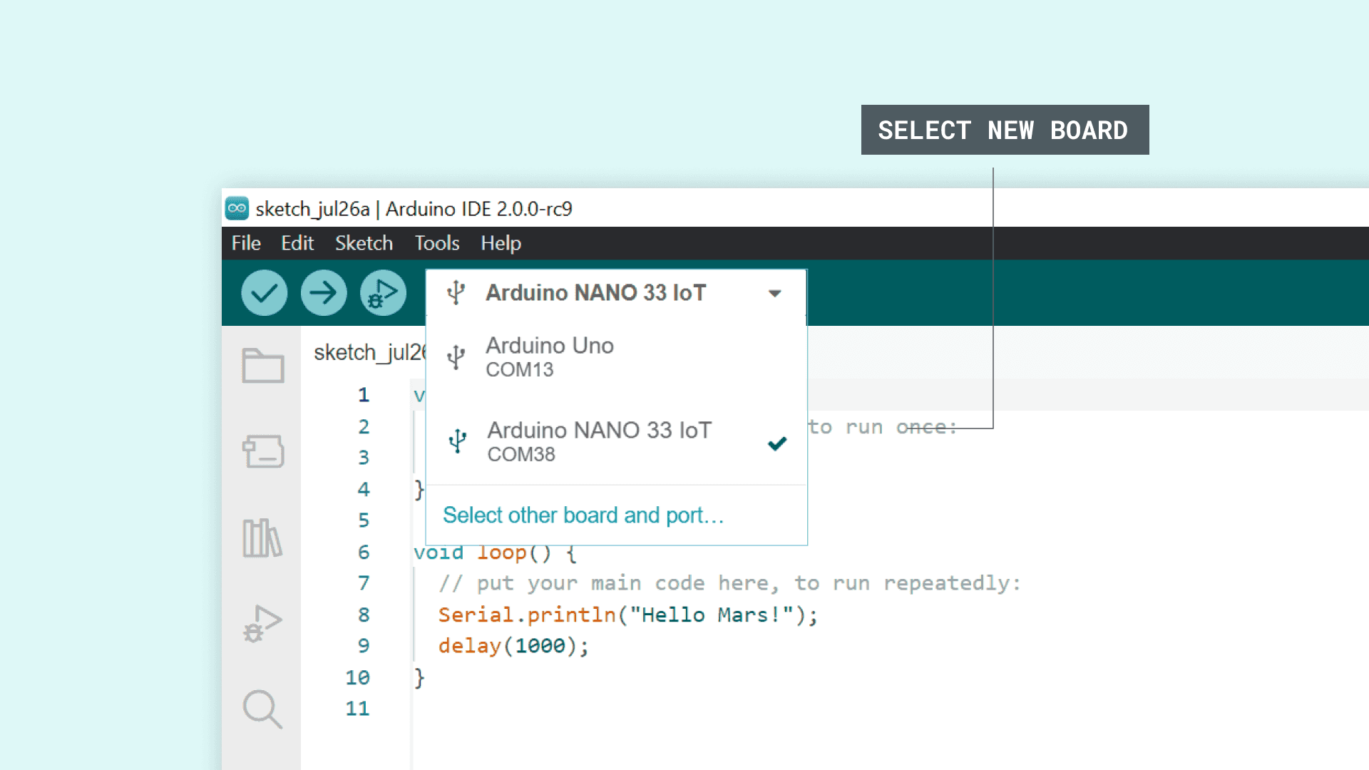 5void loop() {6Serial.println("Hello Mars!");7delay(1000); 8}4. Upload the code to the board, and open the Serial Monitor. We should now see