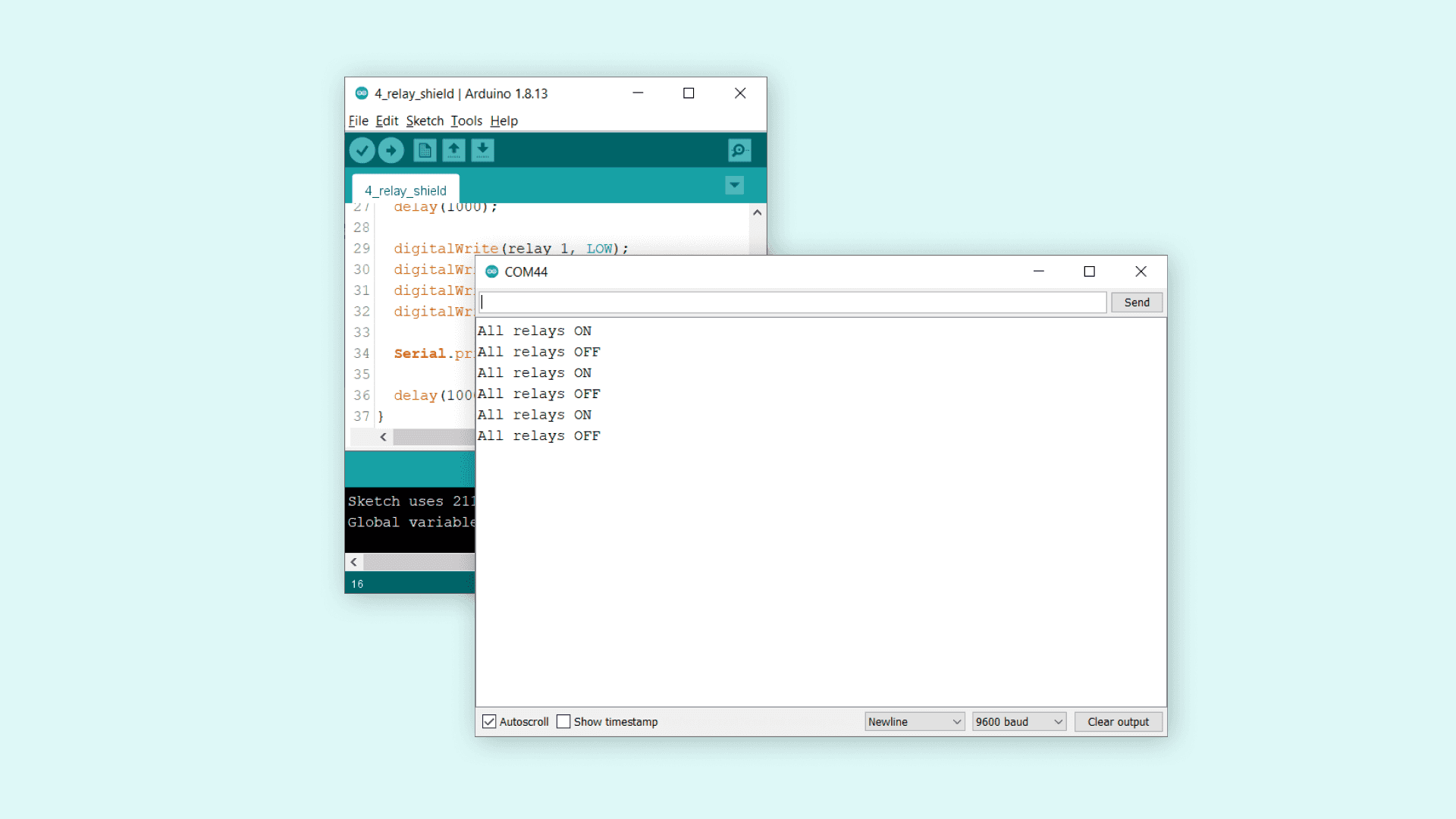 After we have uploaded the code, the program will start running immediately. If everything is working correctly, we will hear a "tick-tack" noise every second. This is the sound of the relays that are mechanically switching on and off. If we take a look at the shield, we will see four LEDs blinking every second. These signify the state of the relays. We can also view the states in the Serial Monitor.