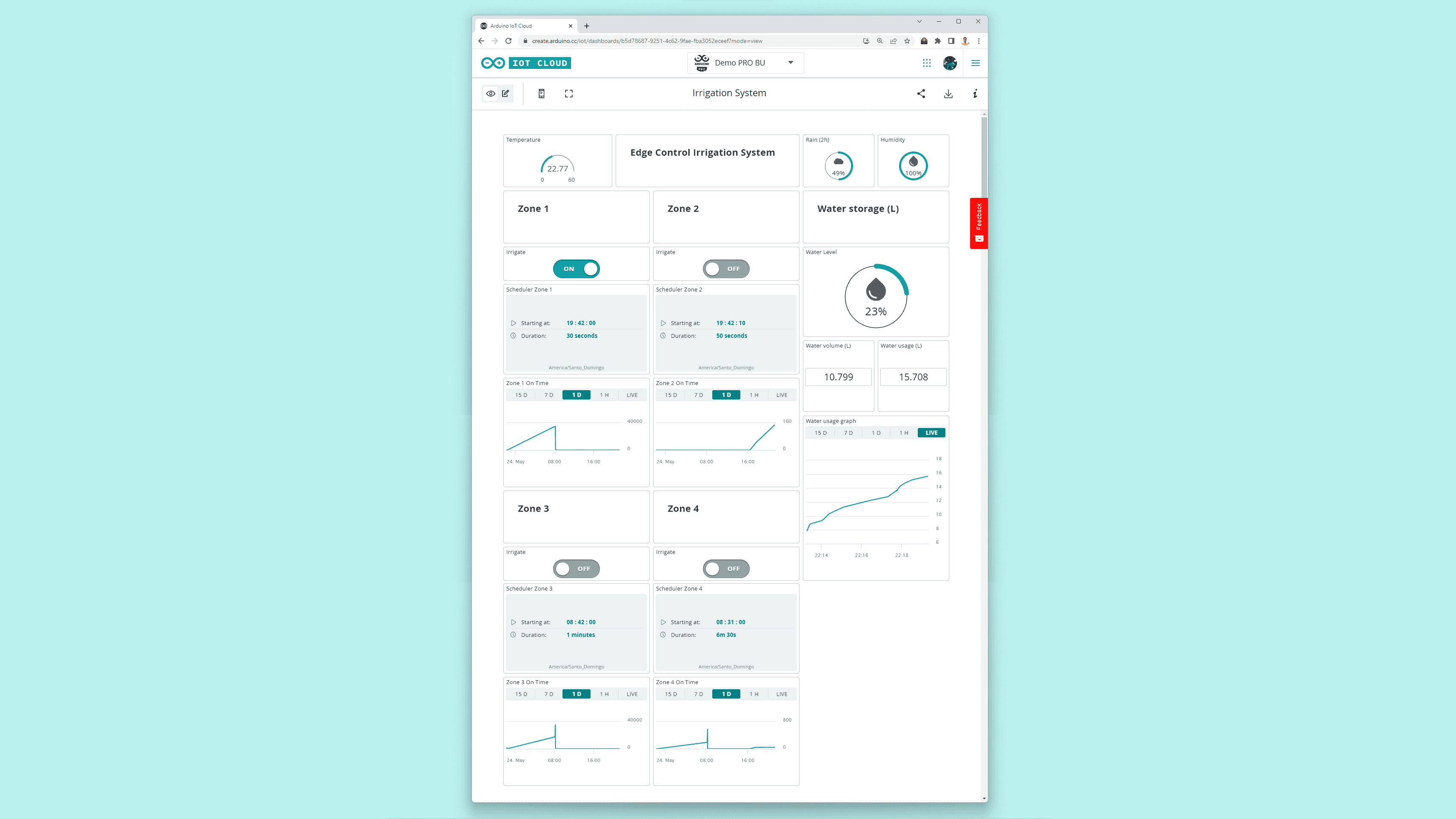 - Monitor average irrigation time and water consumption on dedicated charts on Arduino Cloud.