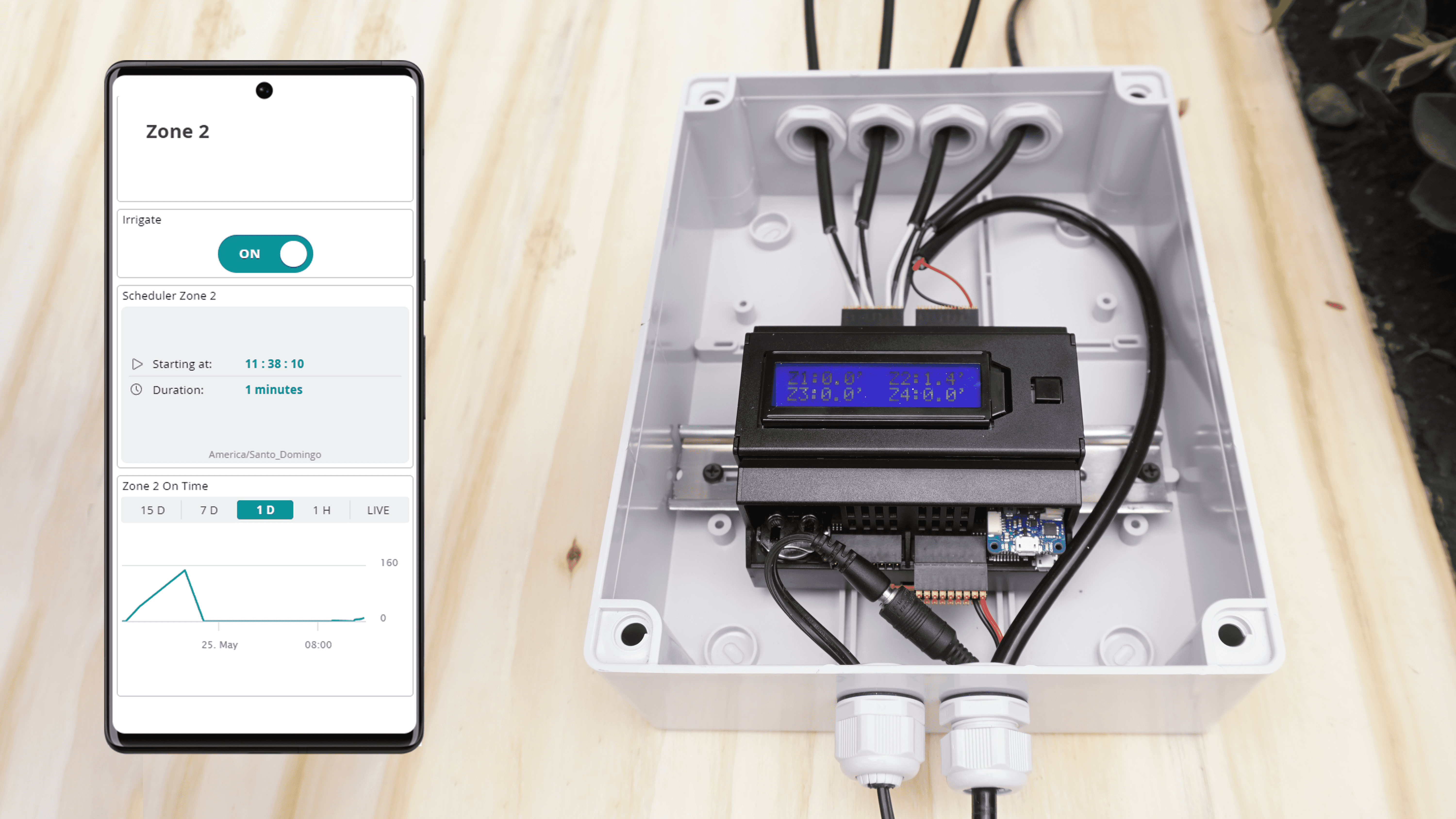- Program irrigation timers from remote through Arduino Cloud by using Wi-Fi® connectivity.