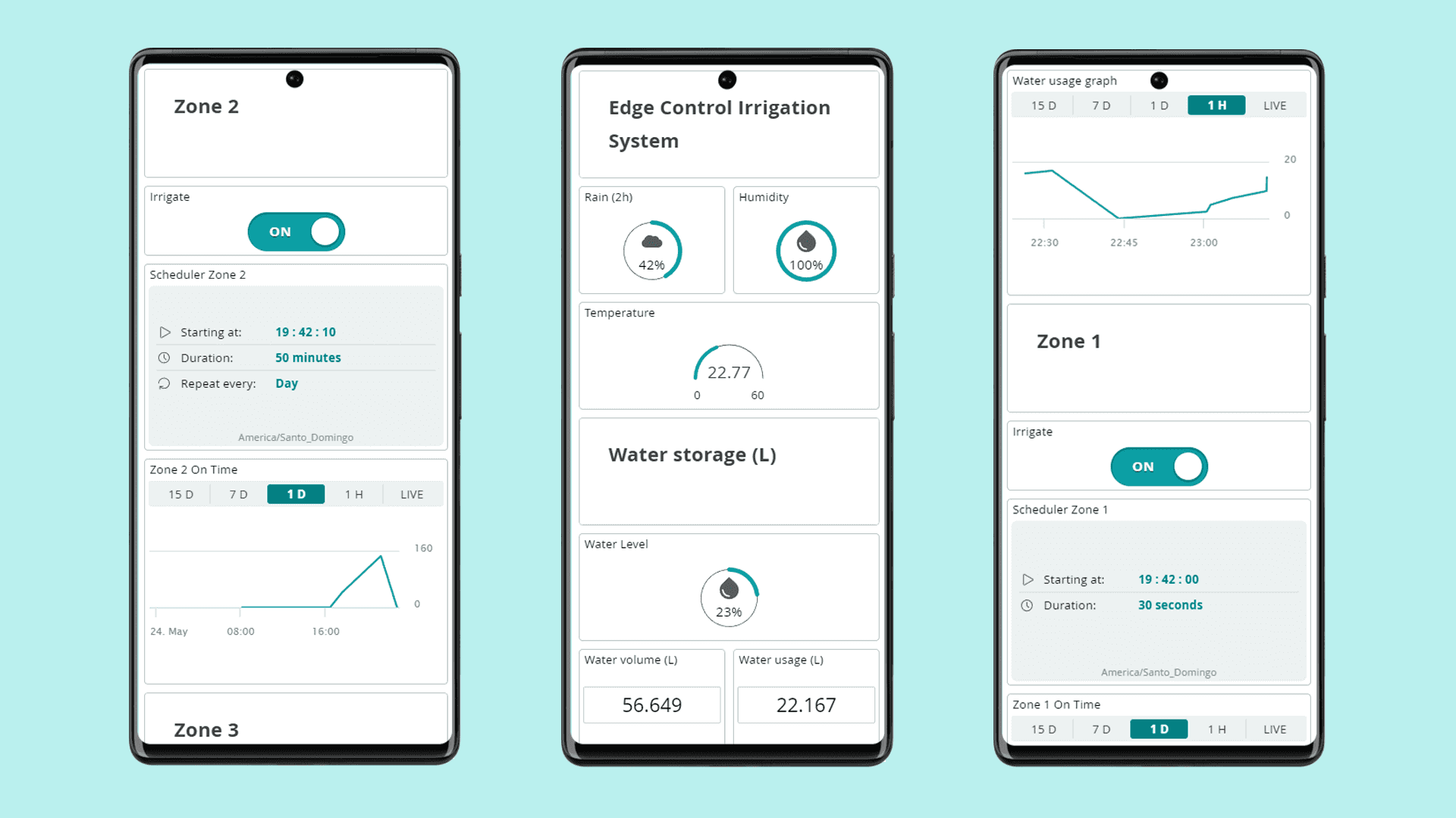 The dashboard is easily accessible from a browser, mobile phone or tablet, allowing a user to receive an instantaneous update on the irrigation status from anywhere.