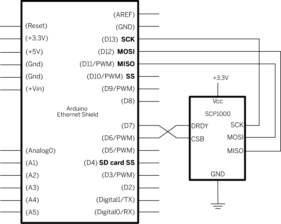 Your Barometric Pressure sensor will be attached to pins 6,7, and the SPI pins of your Arduino / Ethernet shield combo, and powered via your device's 3.3 volt output. Connect the DRDY (Data Ready) pin on your sensor to digital pin 6 on your combo, and the CSB pin (Chip Select) to digital pin 7. Your sensor's COPI (Controller Out Periheral In), MISO (Controller In Periheral Out), and SCK (SPI clock input) pins should then be connected to the SPI pins on your Arduino board/shield. The SPI pin numbers differ depending on which Arduino board you're using and are listed in the SPI reference page. Make sure that the two share a common ground.