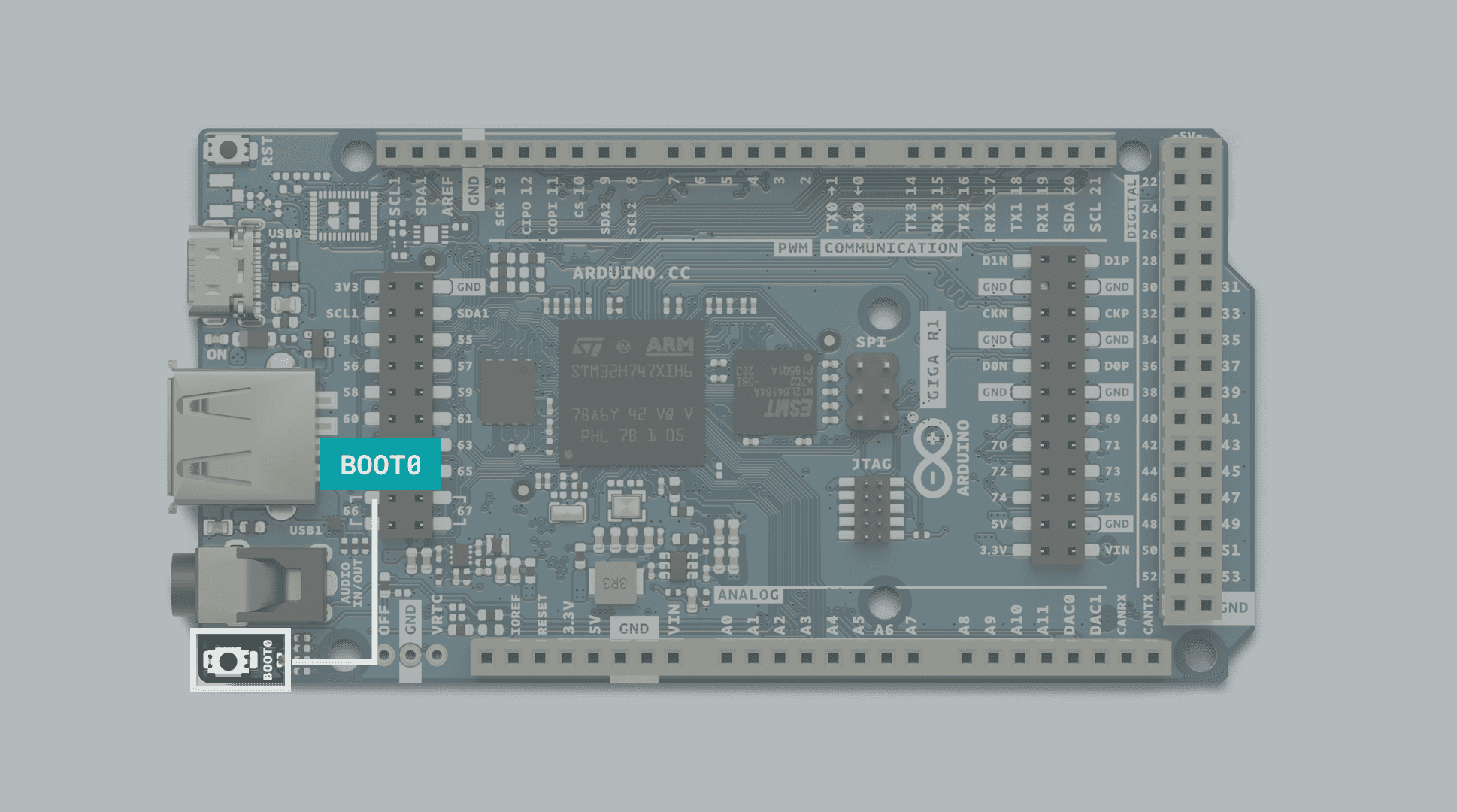 BOOT0 on the board while powering the board will boot it into DFU-mode (Device Firmware Update), letting you reflash the bootloader without the use of external hardware, if you were to ever need to. The state of this button can also be read from a sketch while it is running, giving you a basic interactive component without needing to do any wiring.