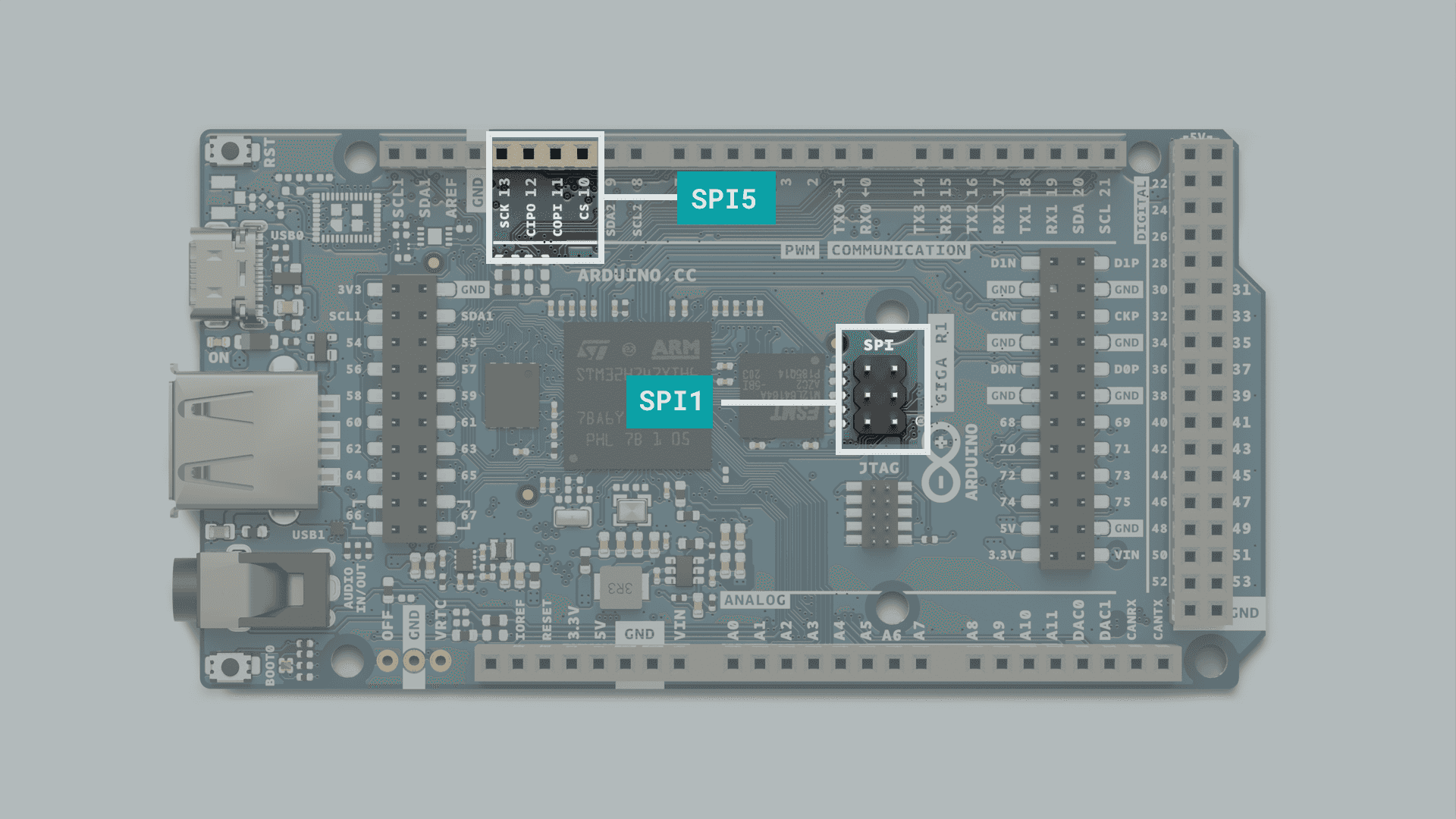 The GIGA R1 has 2MB of internal, and 16MB of external Flash storage. The external Flash storage on the GIGA R1 is QSPI and can be accessed and used to store data. If you need to, you can configure the board to act as a USB flash drive, so you can store files such as images, audio, and more.