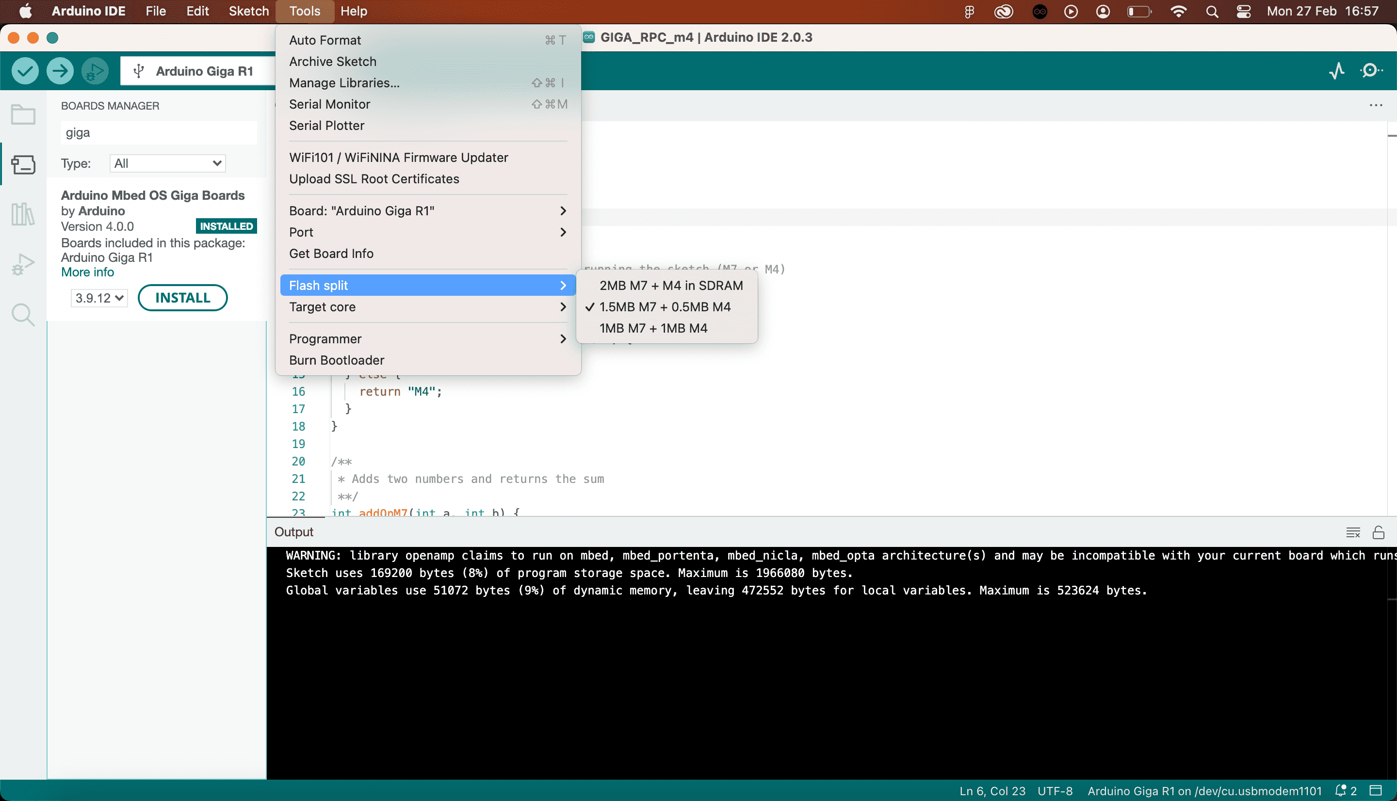 To allocate the flash memory for the M4, the flash memory can be partitioned. This is done by navigating to Tools > Flash Split in the IDE.