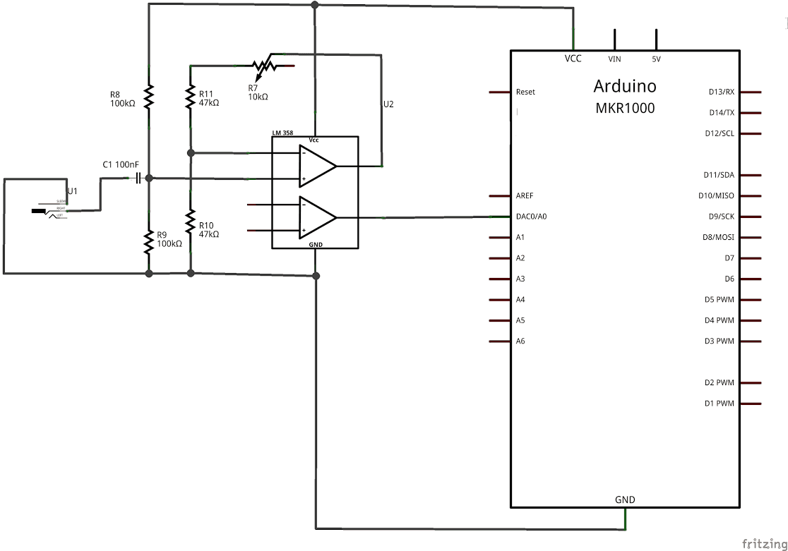 The 10k trimpot allows to adjust the gain of the amplifier matching the signal level with the ADC input range. This adjustment should be made looking at the output on the Arduino Software (IDE) Serial Monitor: when the note reading is stable while playing the same note, the gain is properly set.