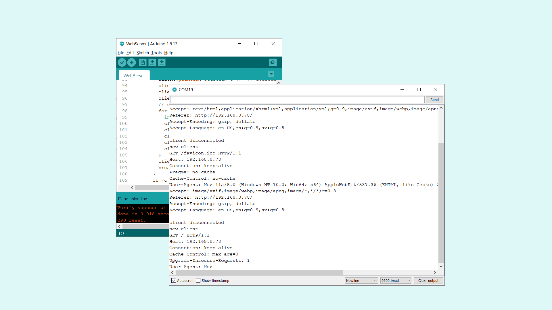 20 // Open serial communications and wait for port to open:21 Serial.begin(9600);22 while (!Serial) {23 ; // wait for serial port to connect. Needed for native USB port only24 }25 Serial.println("Ethernet WebServer Example");26