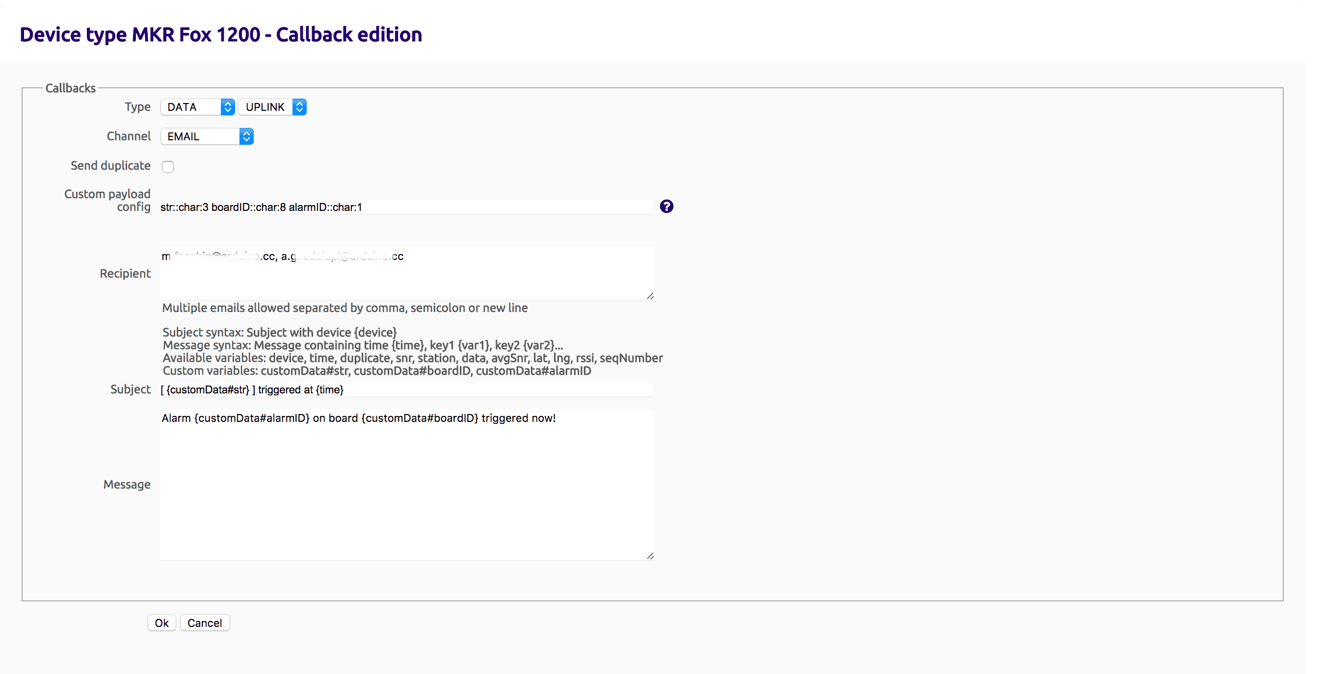 Custom payload config: str::char:3 boardID::char:8 alarmID::char:1 (as explained before) Recipient: write your recipient email address, if you want more than one, use comma separated format.