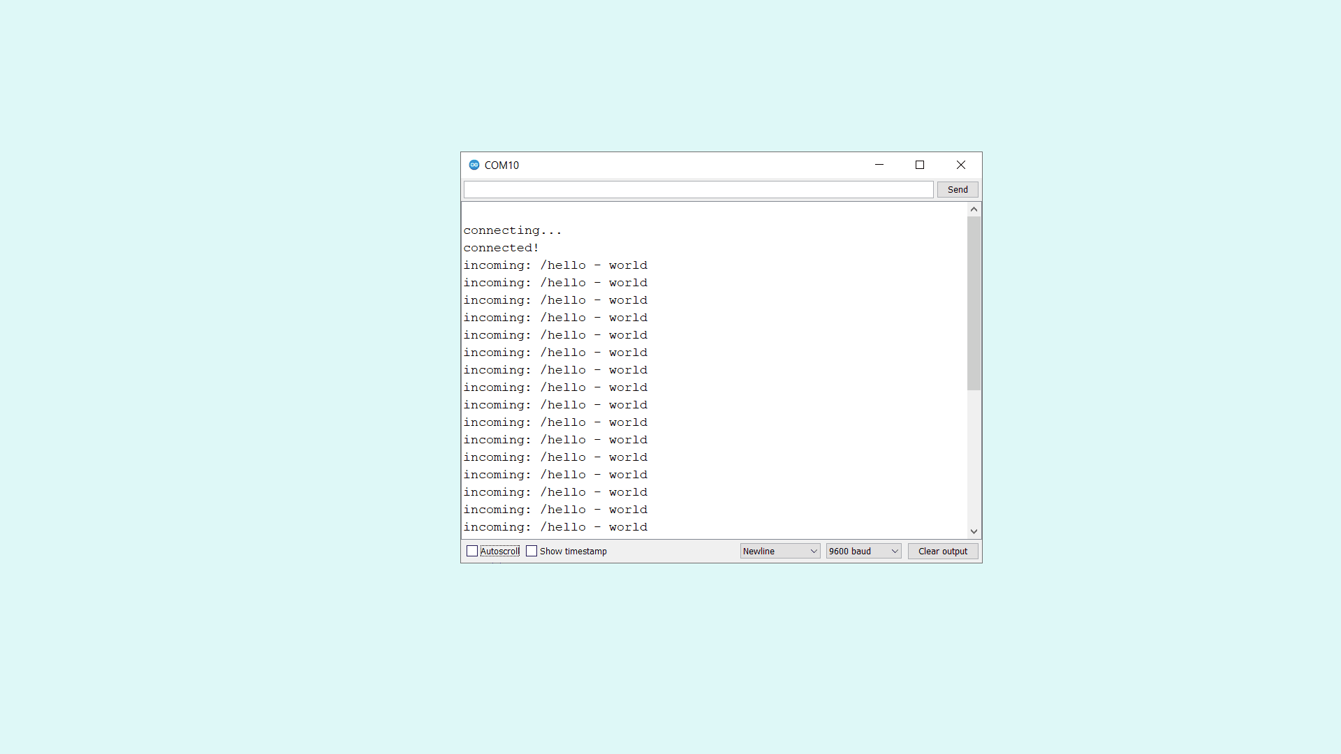 73 // publish a message roughly every second.74 if (millis() - lastMillis > 1000) {75 lastMillis = millis();76 client.publish("/hello", "world");77 }78}Testing It Out