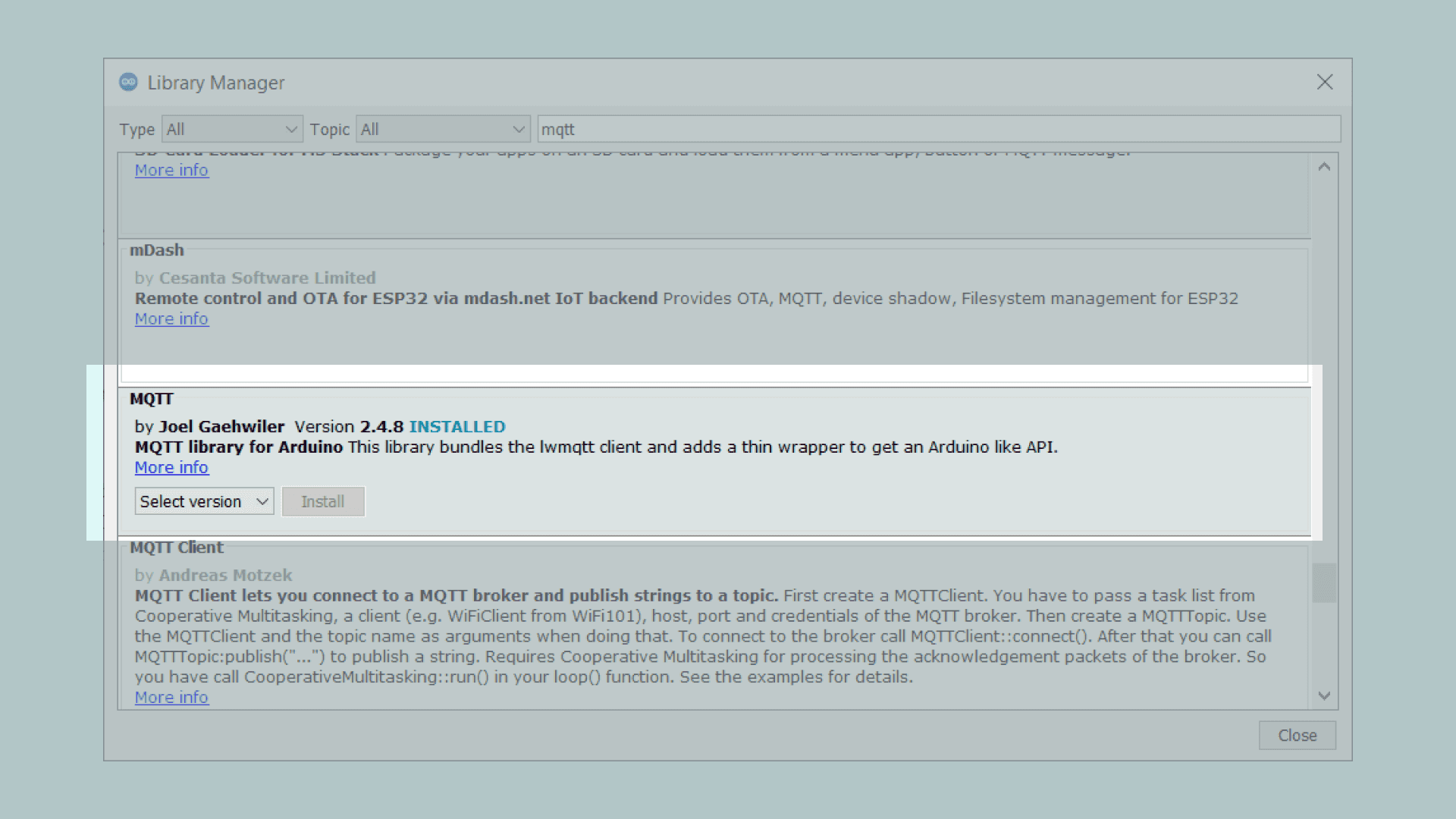 Note: there are several MQTT libraries, make sure you install the right one! The image below highlights the library that needs to be installed.