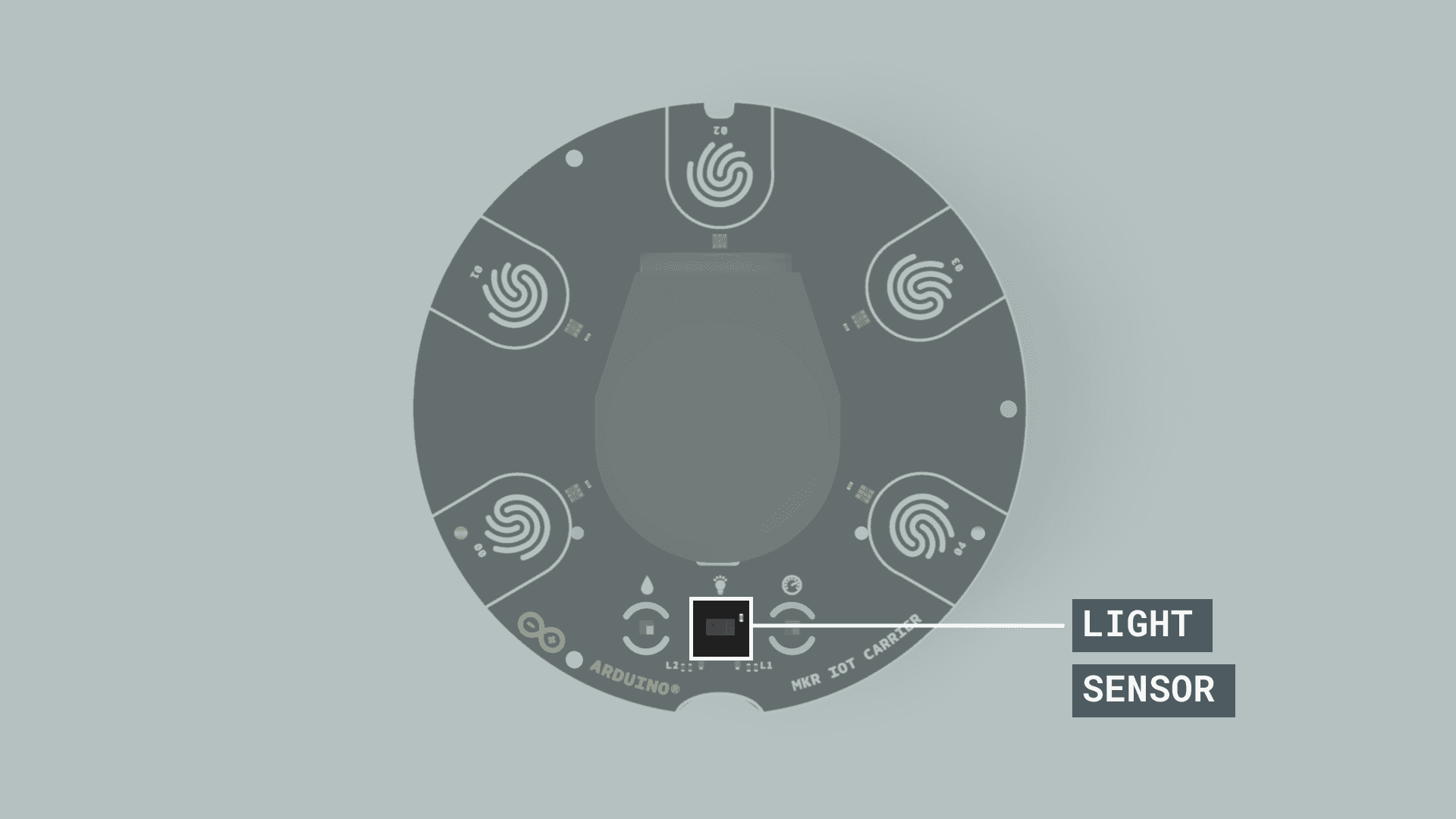The MKR IoT Carrier contains a Broadcom APDS-9960 RGB and Gesture sensors, situated under the display and marked with a bulb icon. The sensor is useful for ambient light and RGB color sensing, proximity sensing, and gesture detection.