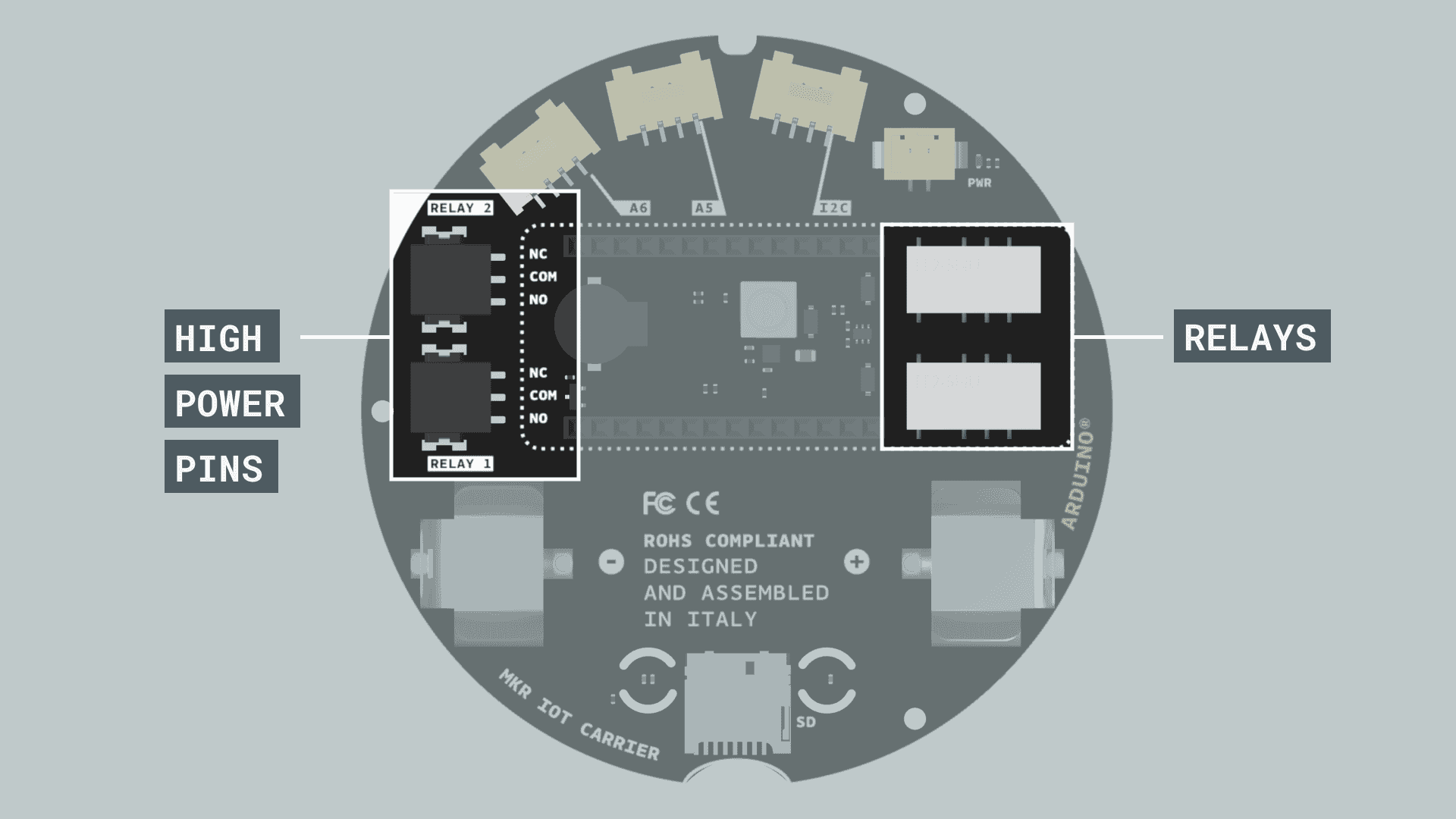 The MKR IoT Carrier is equipped with two 5V Coil voltage KEMET EE2-5NU-L relays, located on the back side of the carrier. The relays are non-latching with a COM (common), NO (Normally open) and NC (normally closed) contacts, and can take up a max of 2A Current and 24 V of input each.