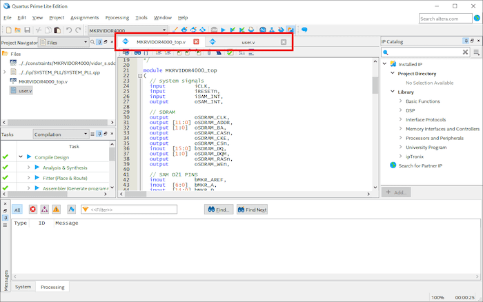 Once you download the sample project, it's time to compile and upload it to the board. Open the Quartus project in the IDE and you'll see something similar to this: