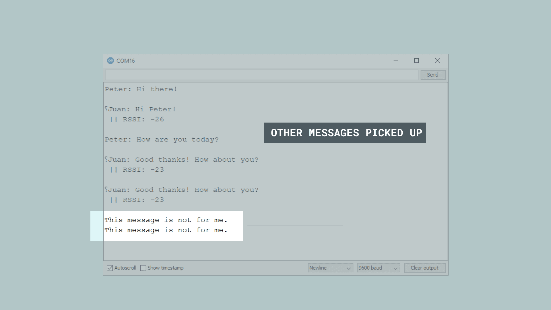 receive() function, we used the following command to handle these messages. 1if (recipient != localAddress && recipient != 0xBB) {2 Serial.println("This message is not for me.");3 return; 4 }And this is how it looks like in the Serial Monitor: