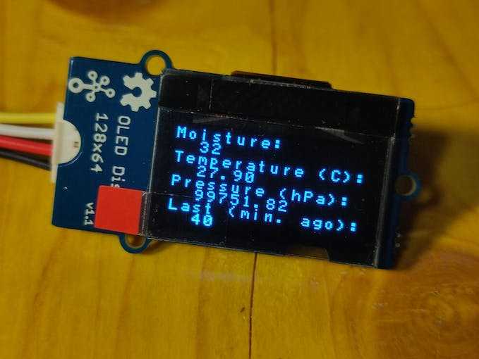 1//1^ & 2^ rows: the moisture value2 SeeedOled.setTextXY(0, 0); 3 SeeedOled.putString("Moisture:");4 //empty the row5 SeeedOled.setTextXY(1, 2);6 SeeedOled.putString(" ");7 //...and then write the new value8 SeeedOled.setTextXY(1, 2);9 SeeedOled.putNumber(moistureStatus);10 //3^ & 4^ rows: the temperature value11 SeeedOled.setTextXY(2, 0);12 SeeedOled.putString("Temperature (C):");13 SeeedOled.setTextXY(3, 2);14 SeeedOled.putString(" ");15 SeeedOled.setTextXY(3, 2);16 SeeedOled.putFloat(temperature);17 //5^ & 6^ rows: the pressure value18 SeeedOled.setTextXY(4, 0);19 SeeedOled.putString("Pressure (hPa):");20 SeeedOled.setTextXY(5, 2);21 SeeedOled.putString(" ");22 SeeedOled.setTextXY(5, 2);23 SeeedOled.putFloat(pressure);24 //7^ & 8^ rows: Last watering25 SeeedOled.setTextXY(6, 0);26 SeeedOled.putString("Last (min. ago):");27 SeeedOled.setTextXY(7, 2);28 SeeedOled.putString(" ");29 SeeedOled.setTextXY(7, 2);30 //milliseconds / 1000 -> seconds / 60 -> minutes31 SeeedOled.putNumber(last_watering_ago / 1000 / 60);The result: