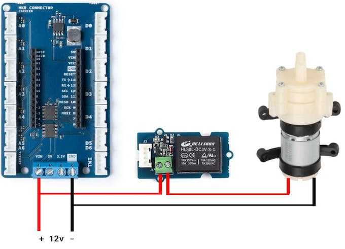 - The Grove relay module, used to activate the water pump - or if you prefer, you can drive an electronic valve (connected to D1)
