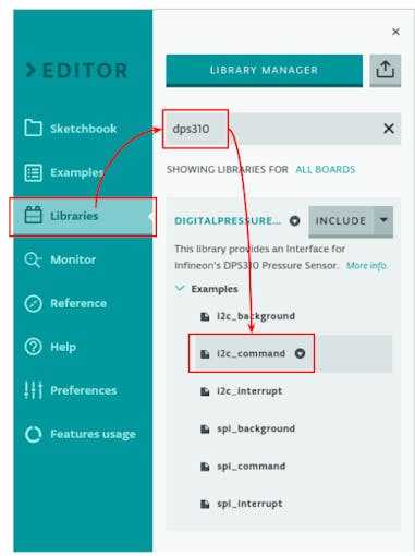 We'll need to add to our code the include of the library and the creation of a new Dps310 object, in order to use it.