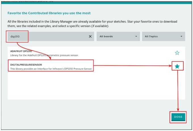 1float temperature;2float pressure;3Dps310PressureSensor.measureTempOnce(temperature, dps310_oversampling);4Dps310PressureSensor.measurePressureOnce(pressure, dps310_oversampling);We'll use these values later on!